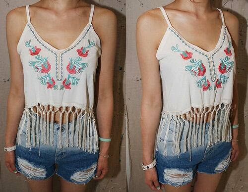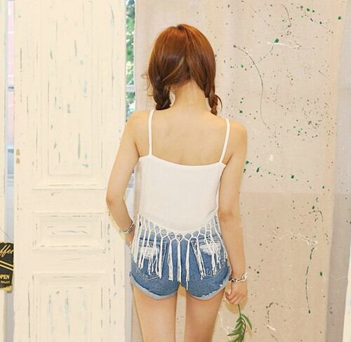 おへそが出るほどのショート丈にフリンジが付いていて