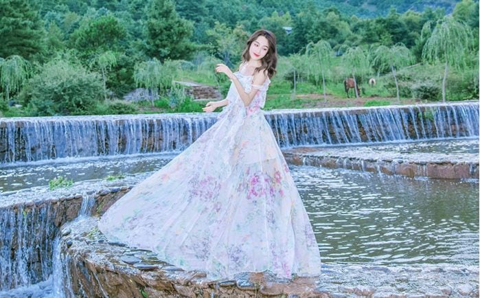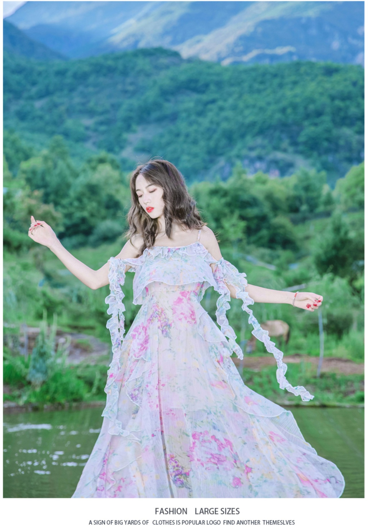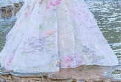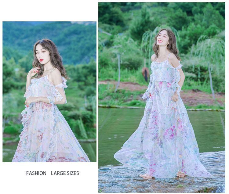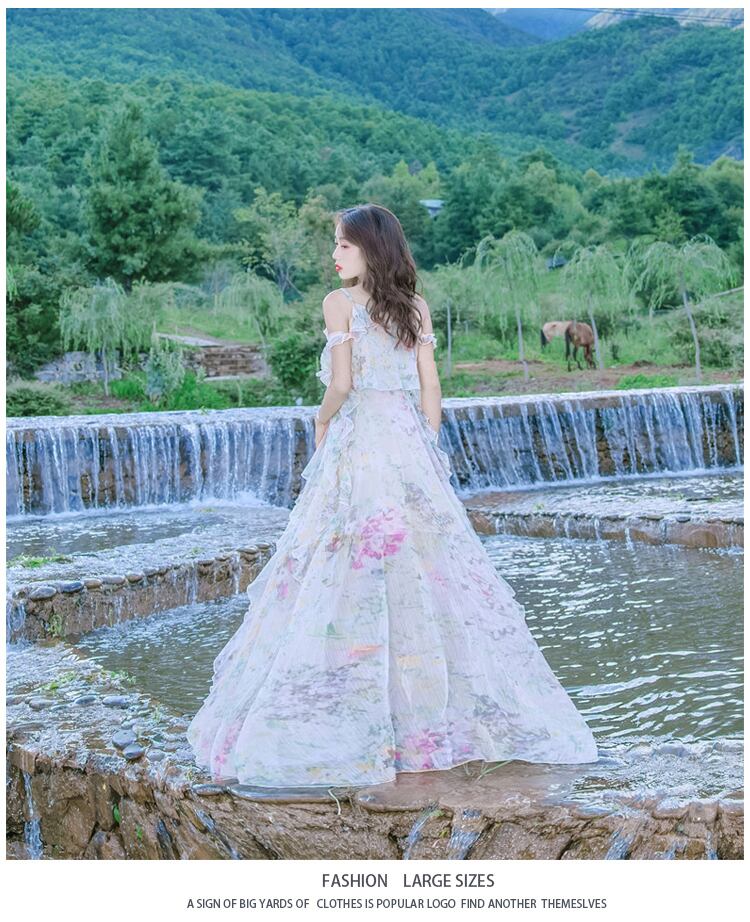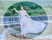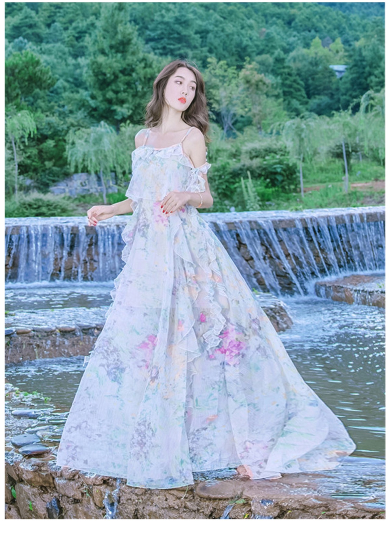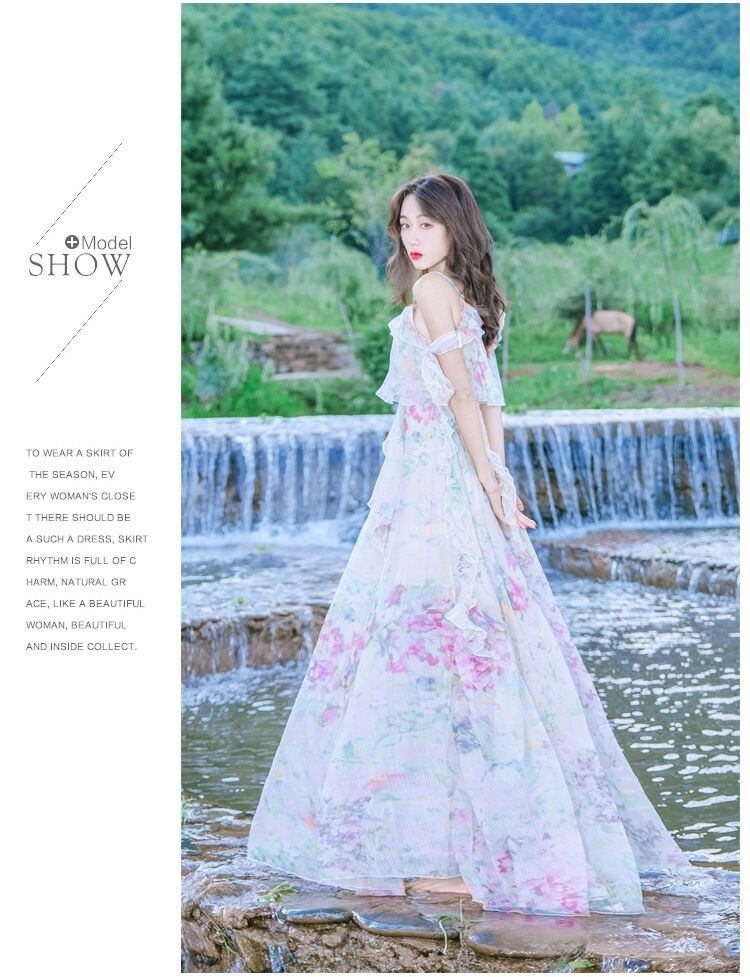 水彩のパステルなカラーと花柄の柄使いがフェミニンなロングワンピースです☆