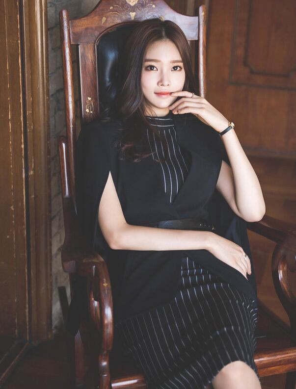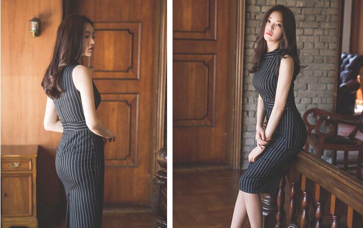 タイトなシルエットに細めストライプとハイウエストベルトが