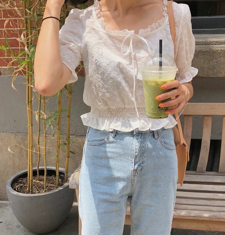 フリル使いの効いた袖、裾、ネックラインがアクセントに。