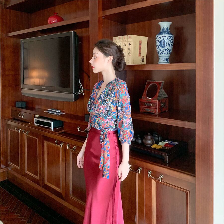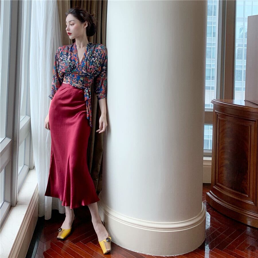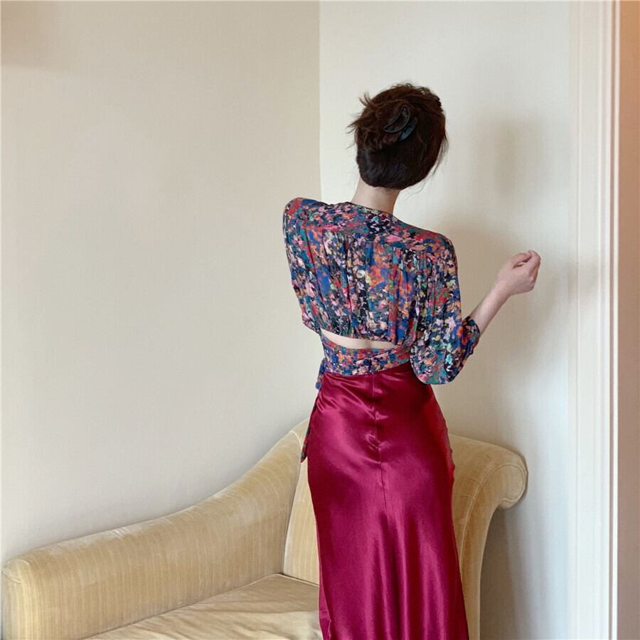 光沢感のあるスカートと花柄ブラウスのセットアップが登場!