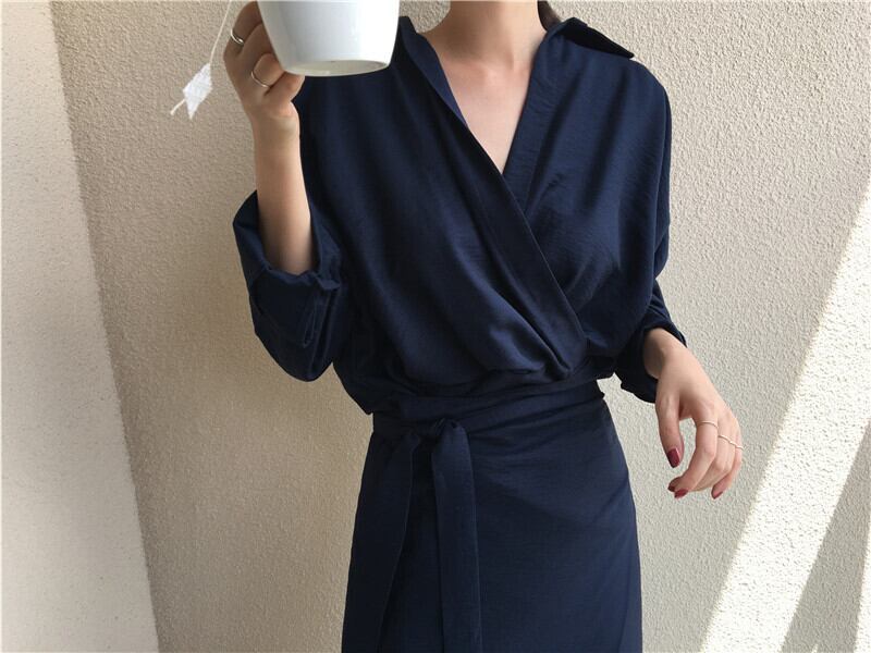 シンプルながらゆったりめのVネックとウエストマークで大人キレイを演出。