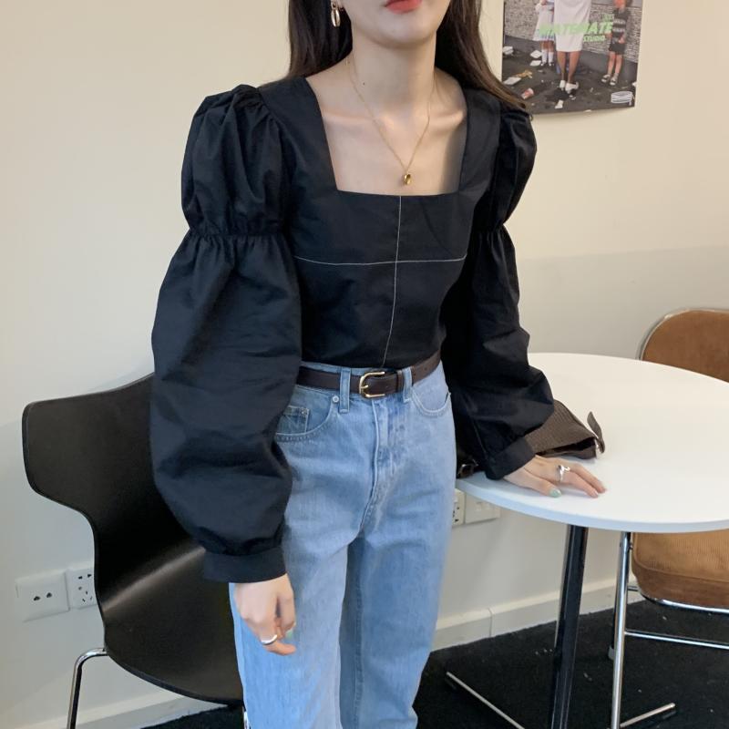 スクエアネックでデコルテ見せ、ボリューミーな袖でトレンドをオン。