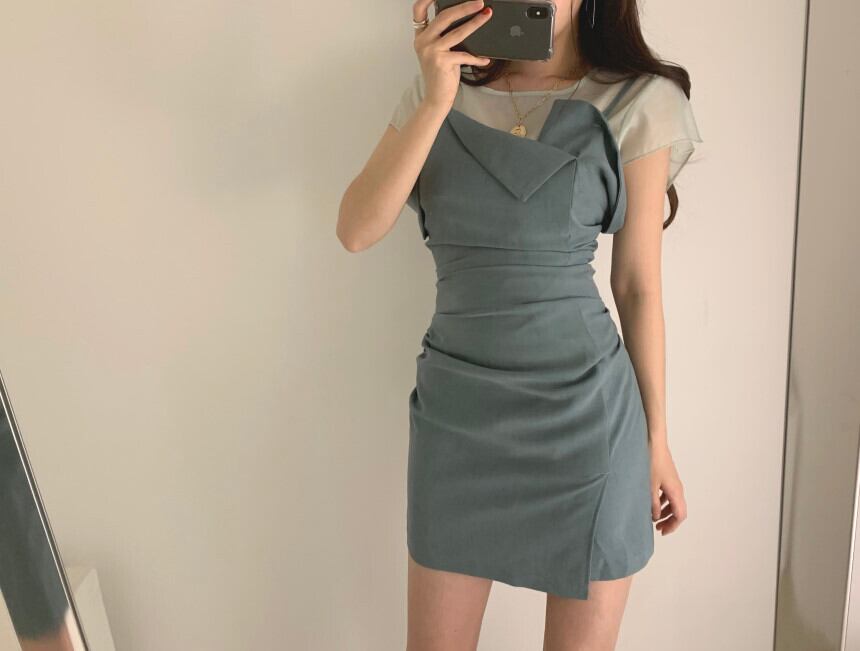 ワンピースの折り返しネックラインが特徴的なミニ丈の一枚です♪