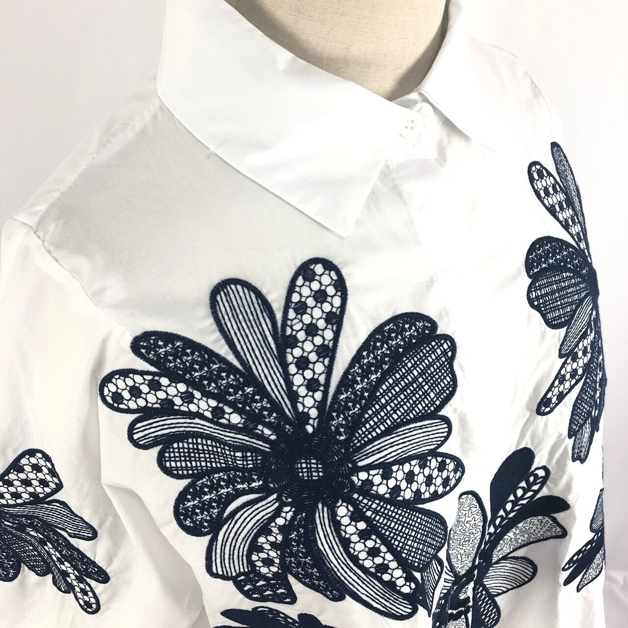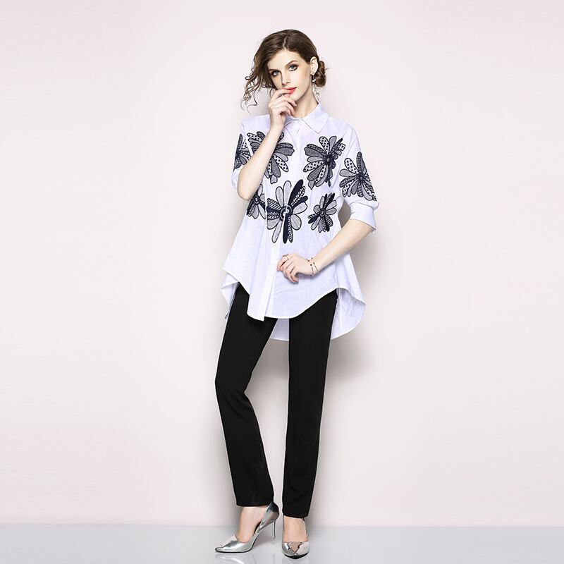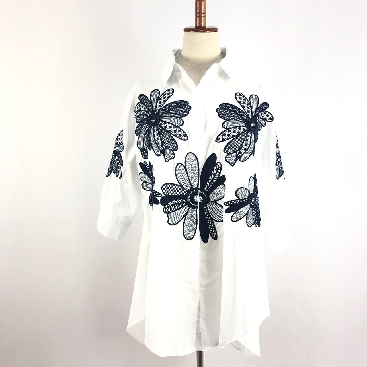 エンブロイダリーフラワーがアクセントになったロングシャツ。