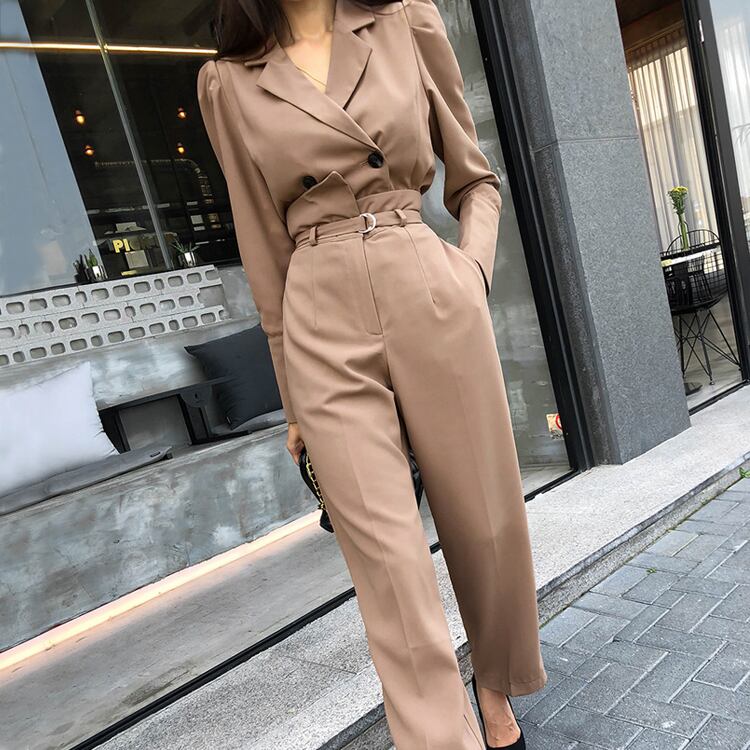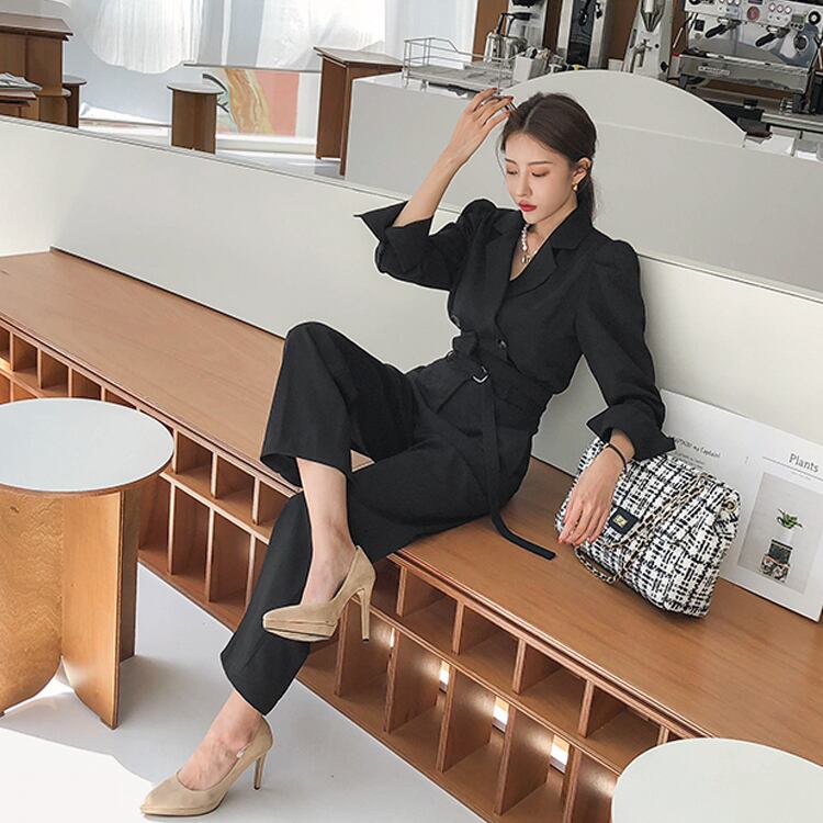ジャケットカラーデザインがこなれたトップスとパンツのセットアップ。