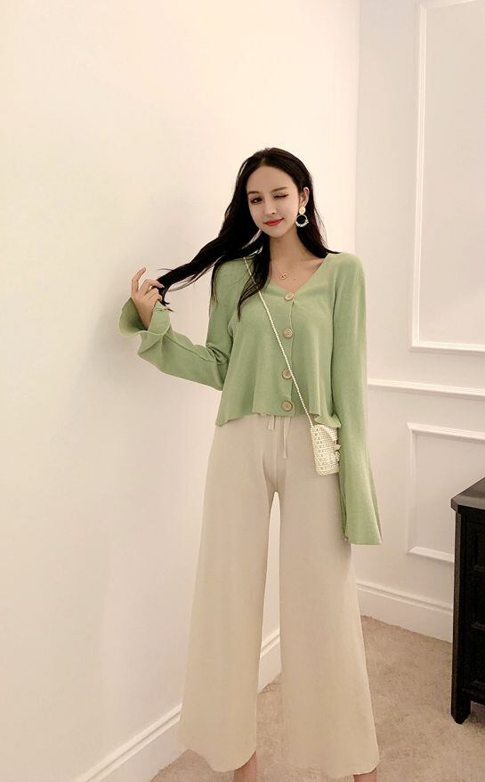 Vネックのトップスはフロントボタンでカーディガンとしても着用可◎