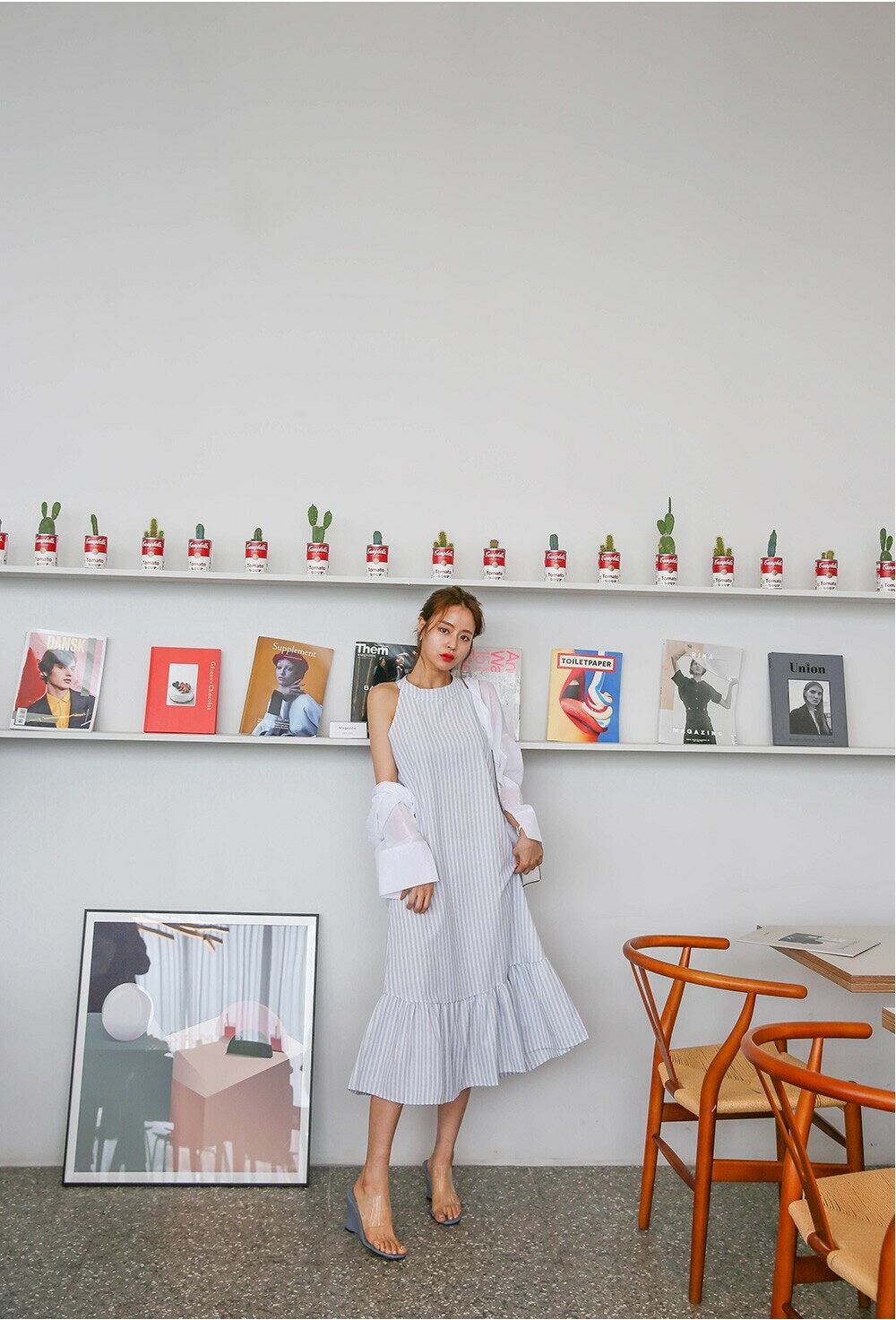 ブルーのストライプ柄が清涼感を出すノースリーブのワンピース。