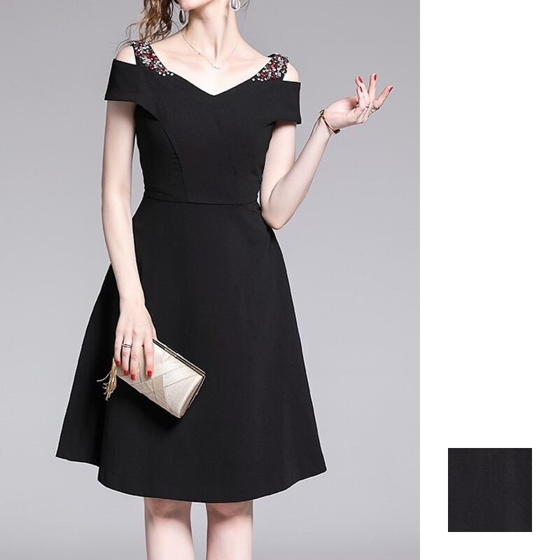 カットショルダーラインのストラップにビジューをあしらったエレガントさがツボ。