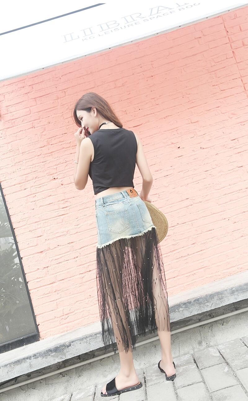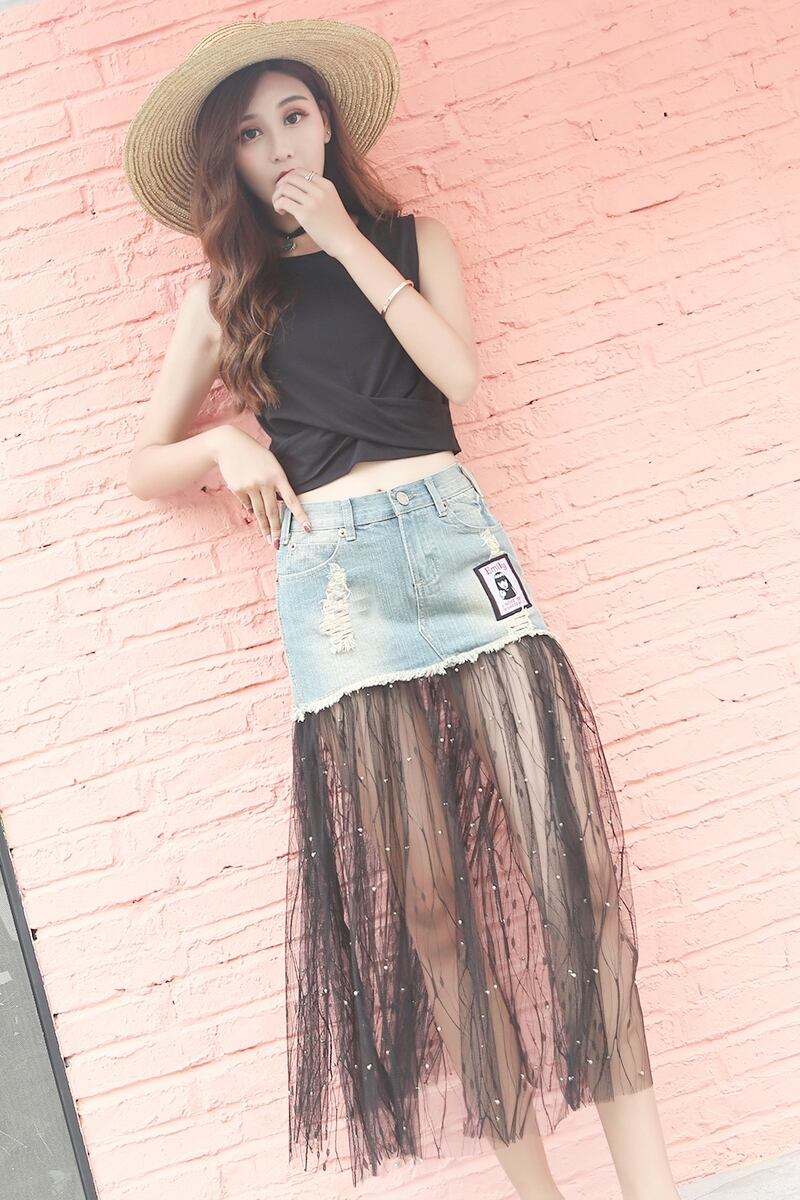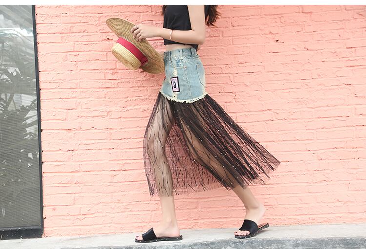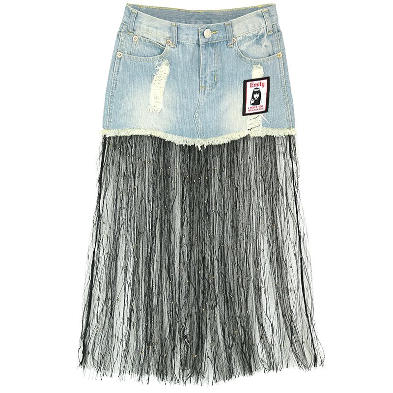 カジュアルデニムから下をパールをちりばめたチュールで切り替えたデザイン。