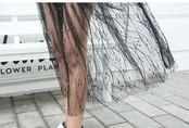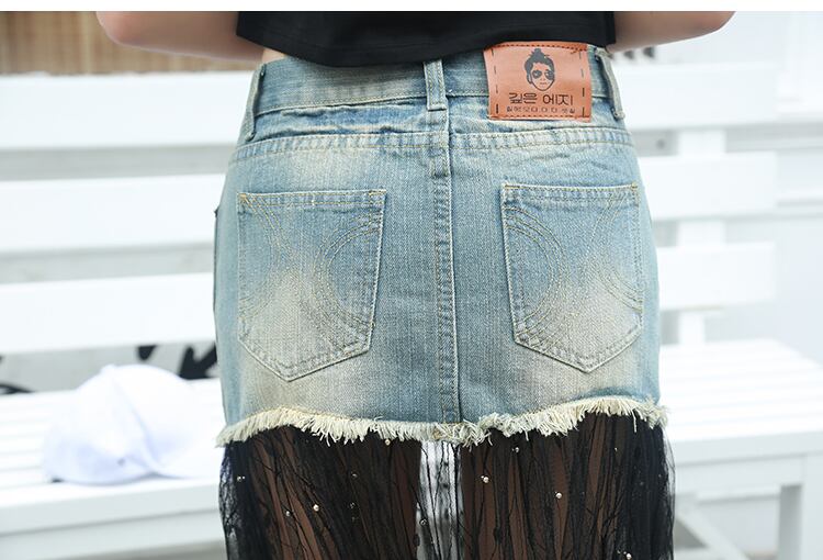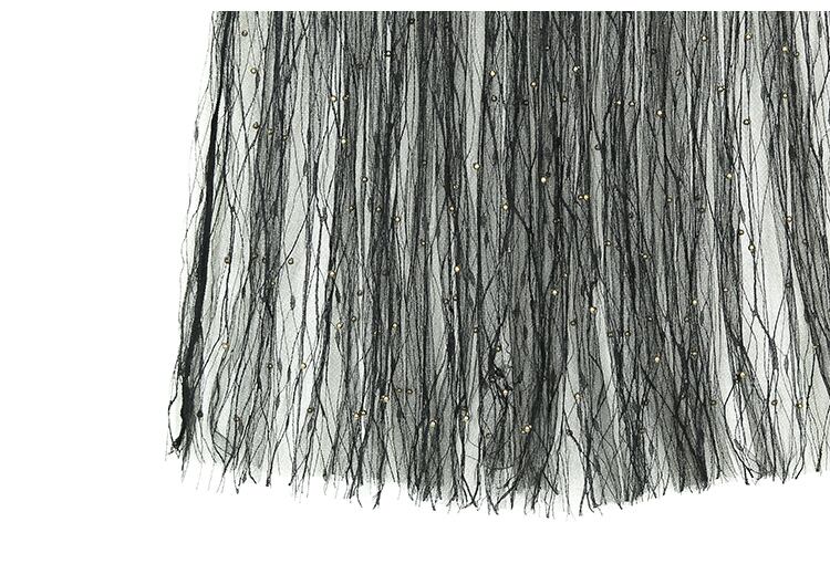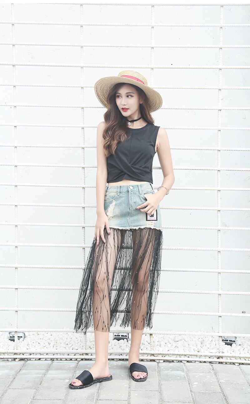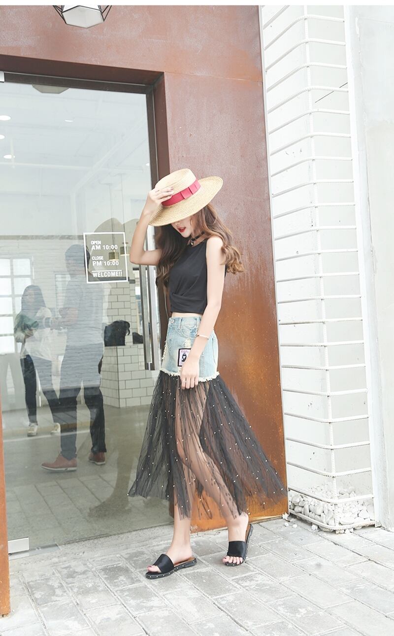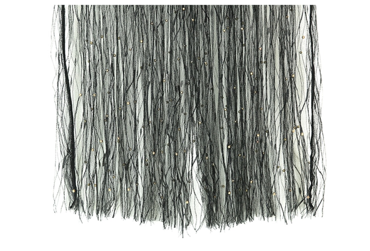 カジュアルデニムから下をパールをちりばめたチュールで切り替えたデザイン。