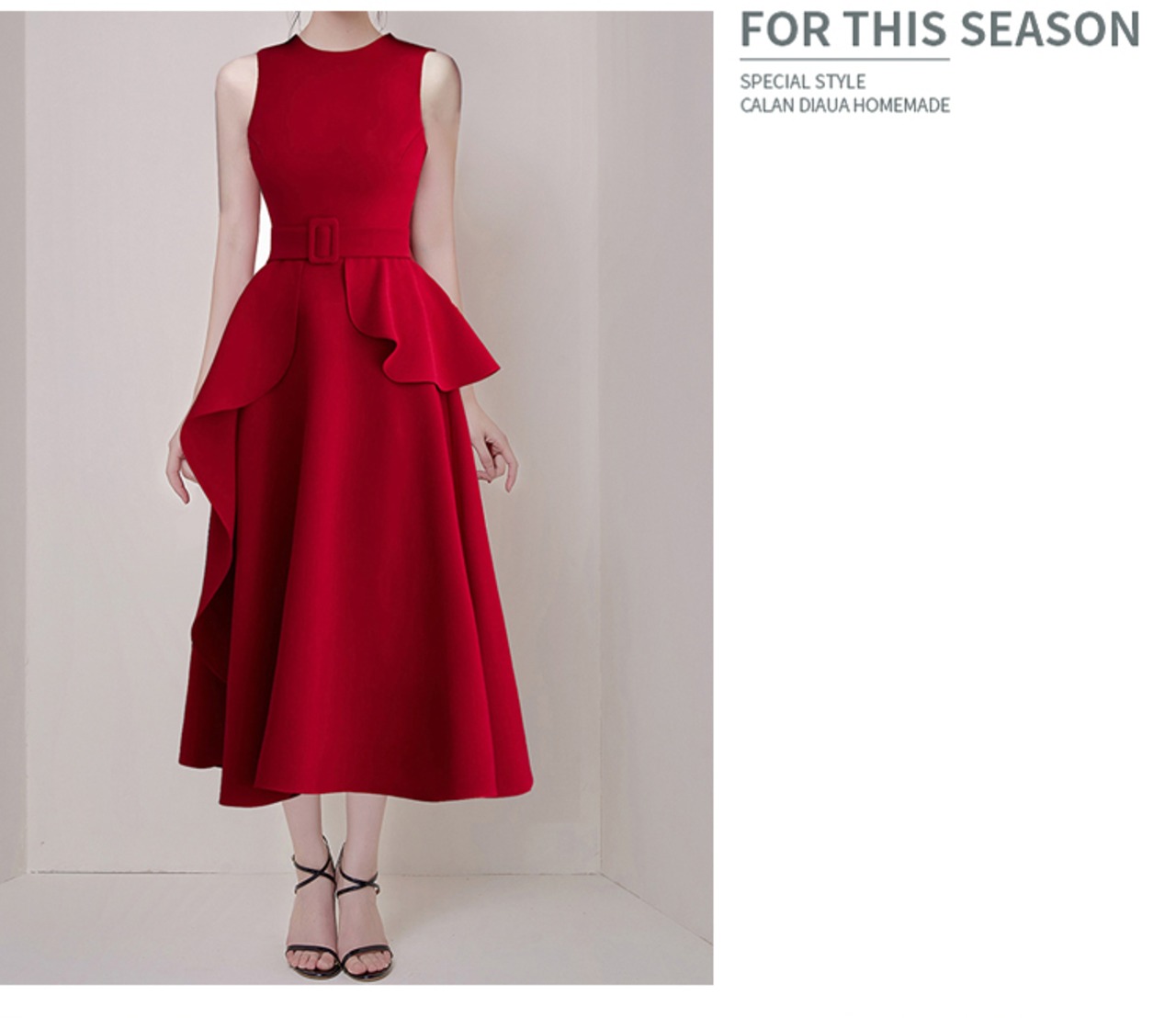 ハイウエストのベルトとペプラムライクなフリル使いがポイントです♪