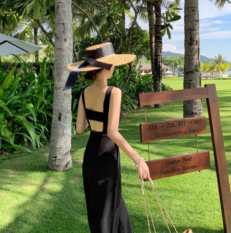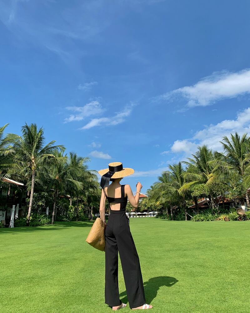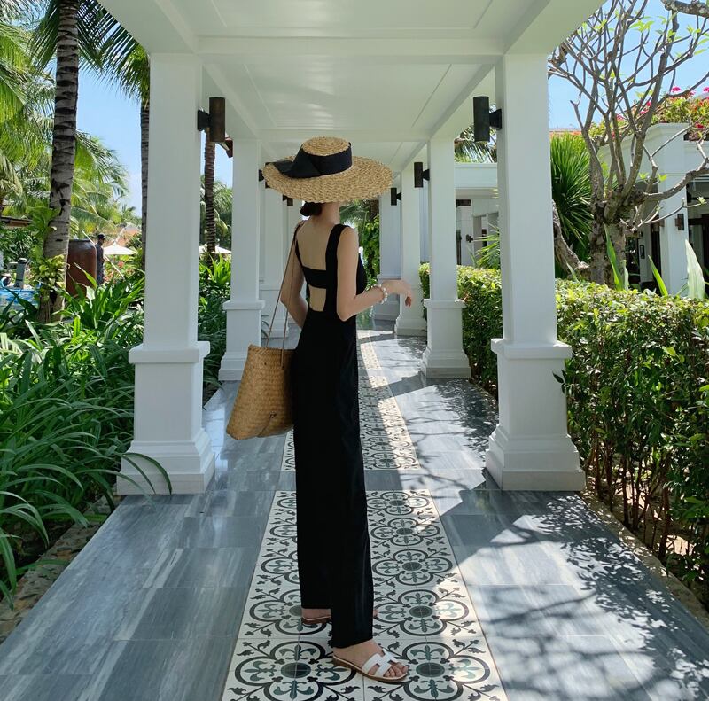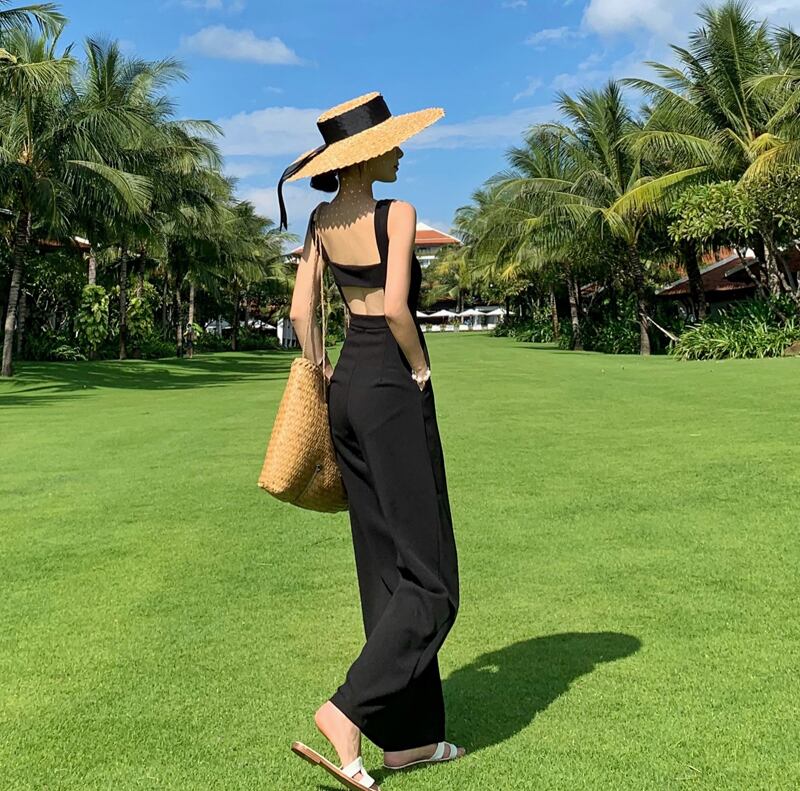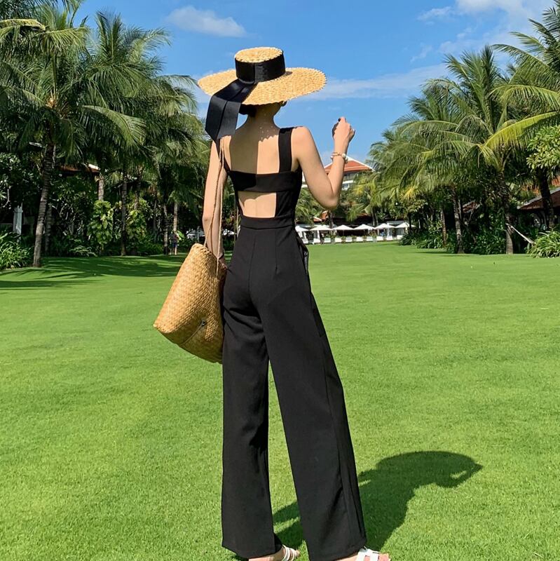 シンプルな無地ブラックで大人らしい夏感を出すオールインワンです。
