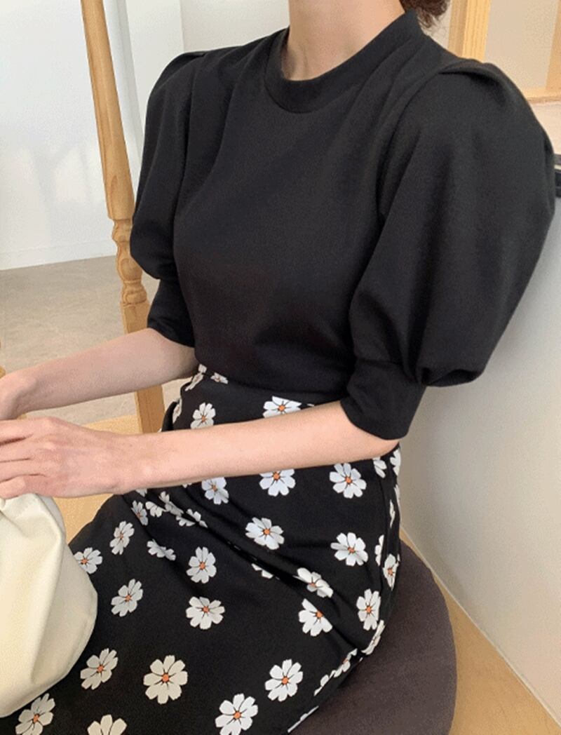 ペールカラーのトップスはパフスリーブでトレンドライクに。
