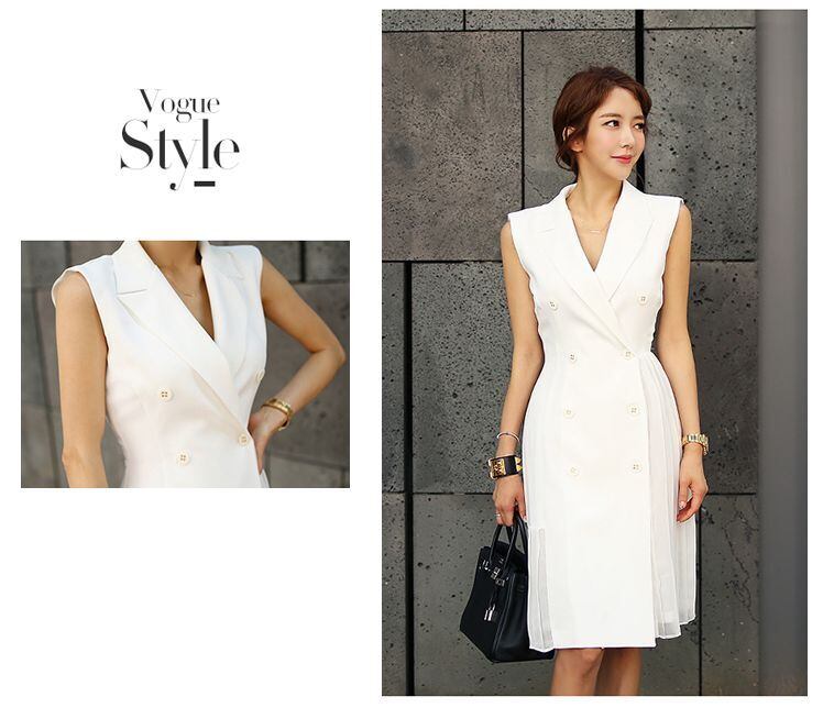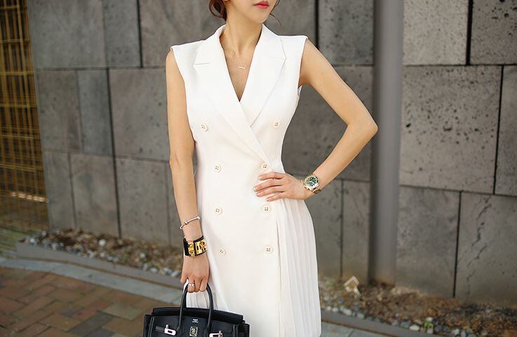 ジャケットカラーのノースリーブでエレガントさをぐっとアップ。