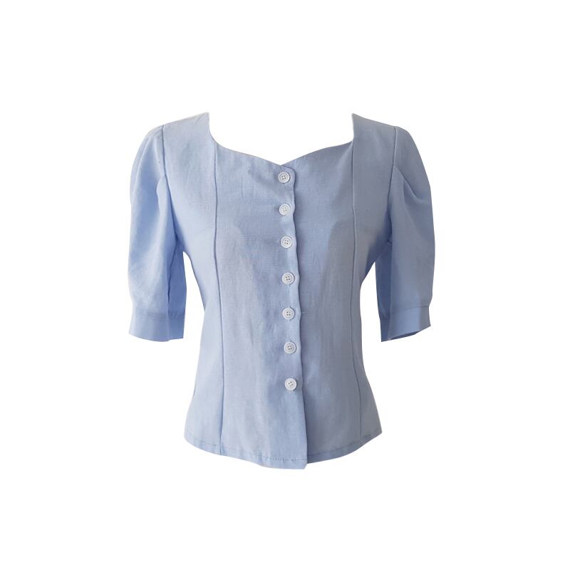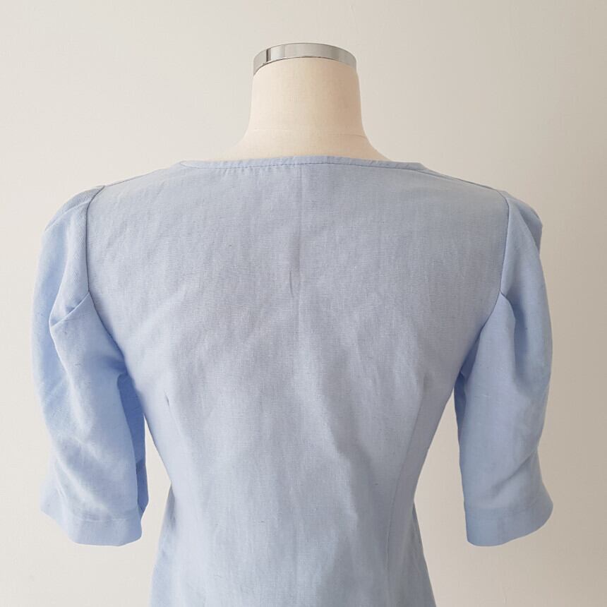 フロントボタンと切り替えライン、パフスリーブのみのシンプルなデザイン。