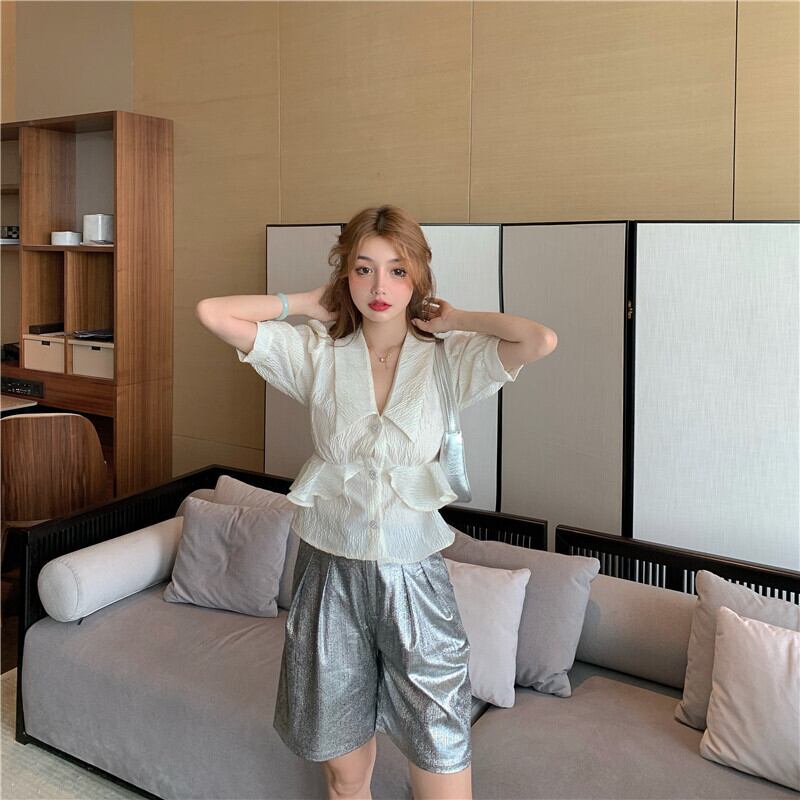 トップスのフリル使いとシャツ襟が特徴的なセットアイテムです♪