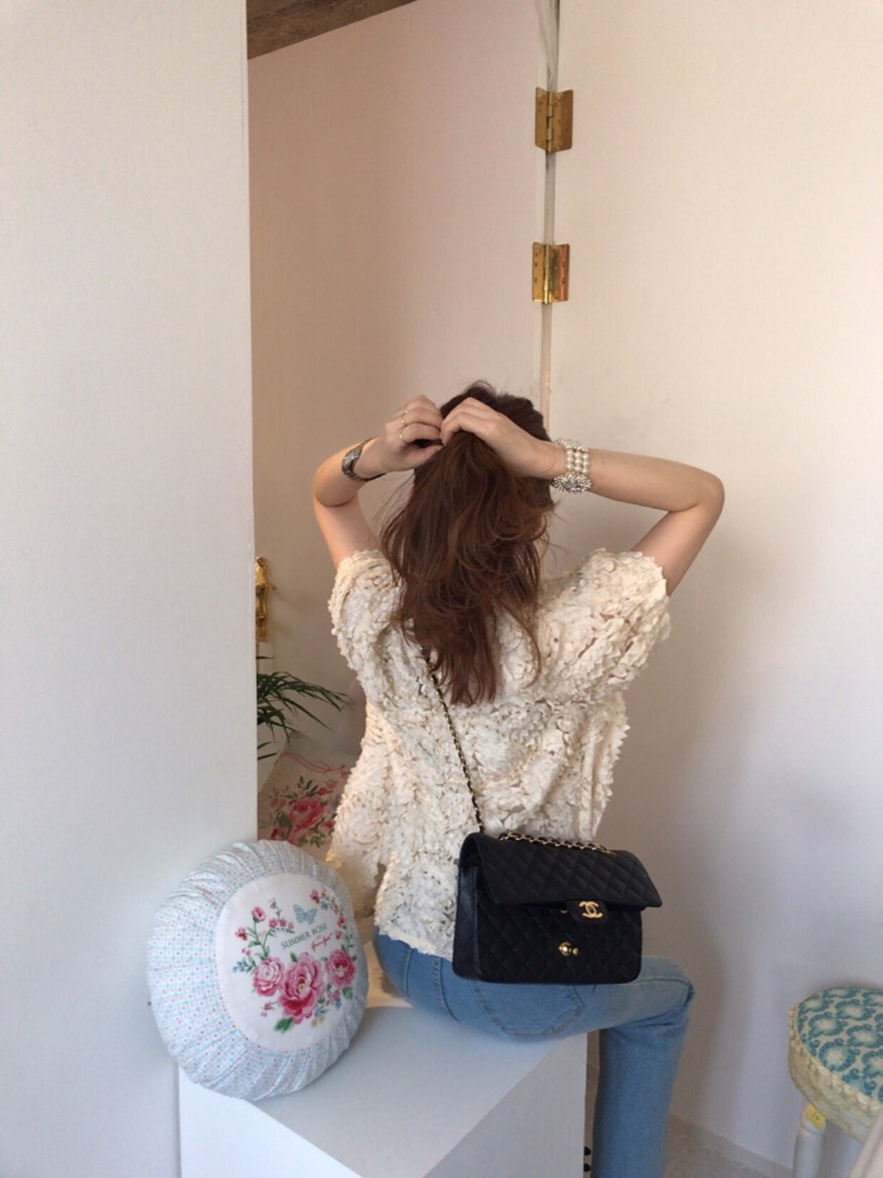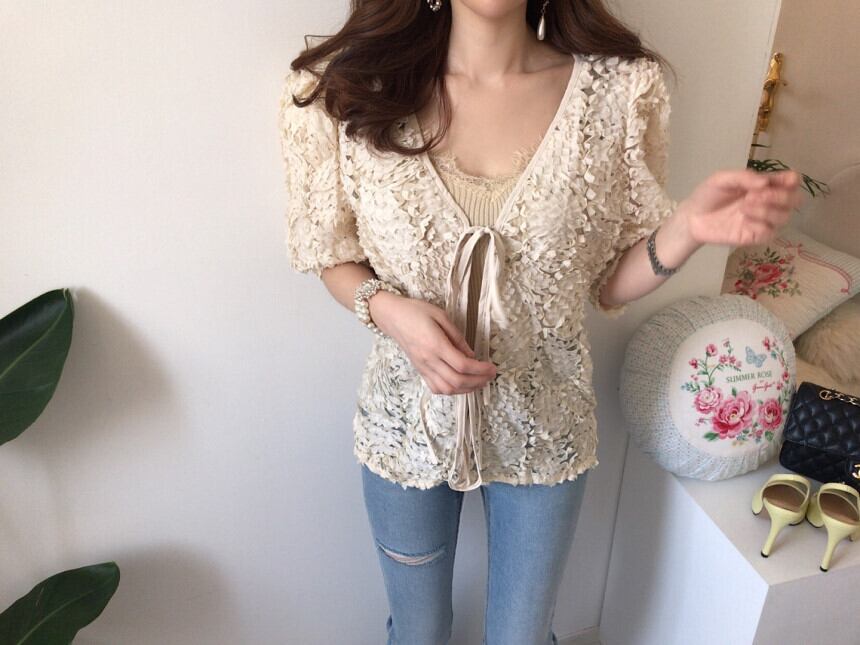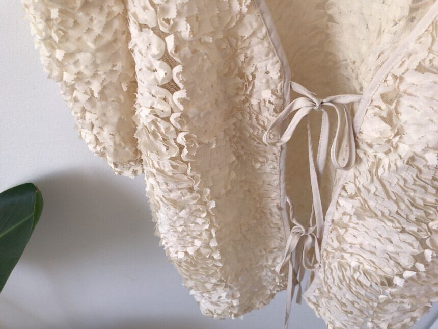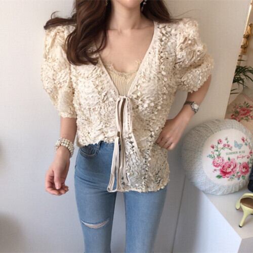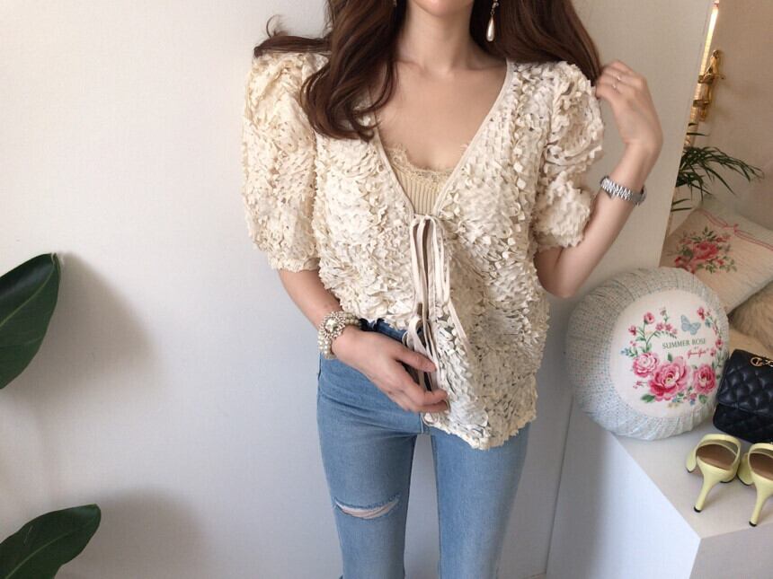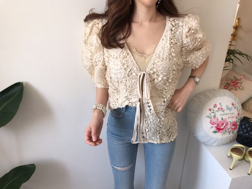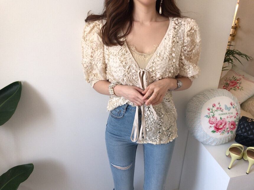 リボンタイでオープン・クローズを仕上げるレトロガーリーな一枚です♪