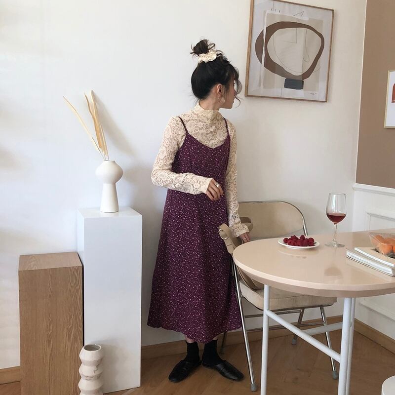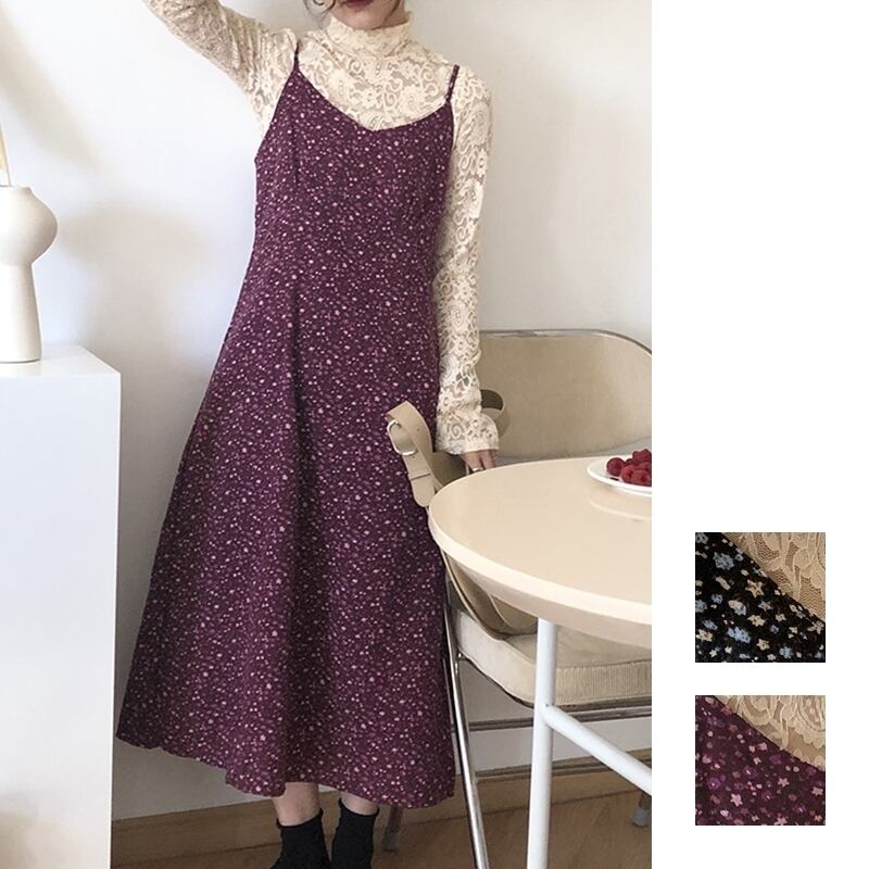 シアー感のあるレーストップスとレトロなキャミワンピースのセット。