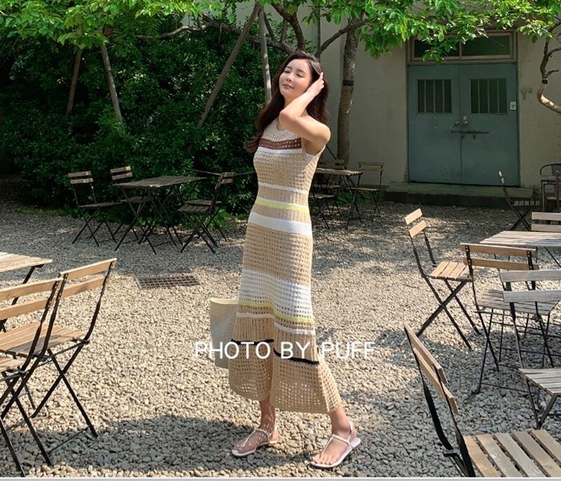 セミタイトで美ラインを引き出すノースリーブのロングワンピース。