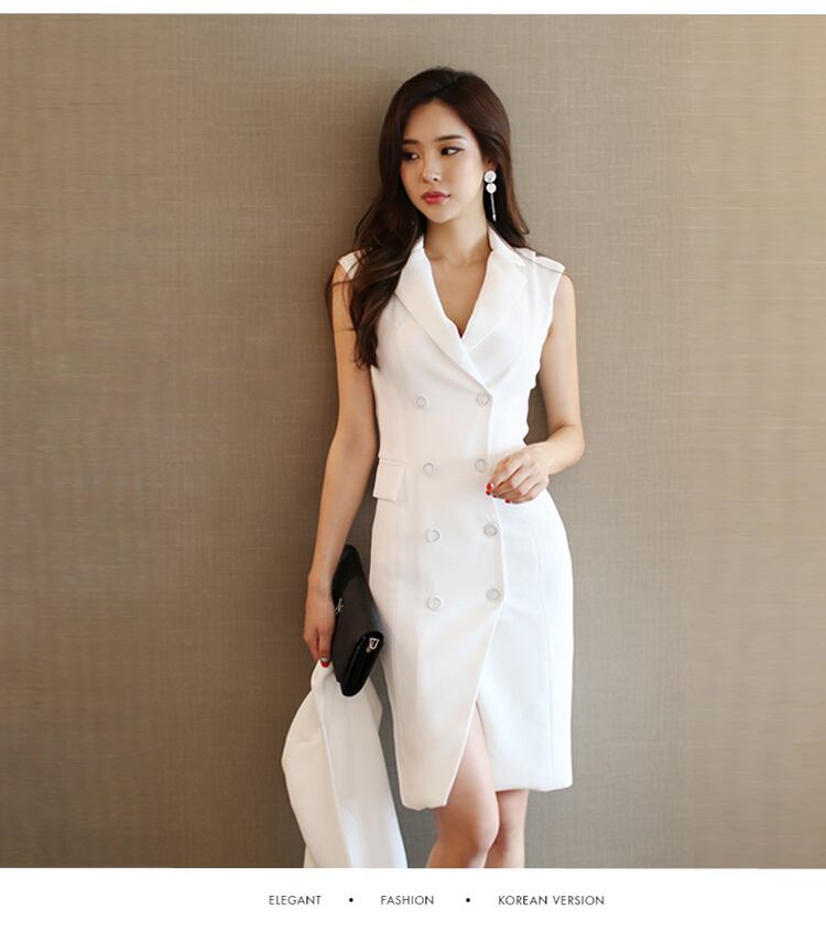 タイトなノースリーブワンピースはボタンやスリットをあしらって…。