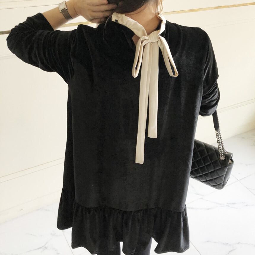 シンプルな色合いに映えるリボンタイで地味さをオフ。