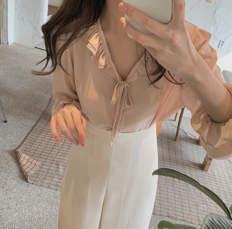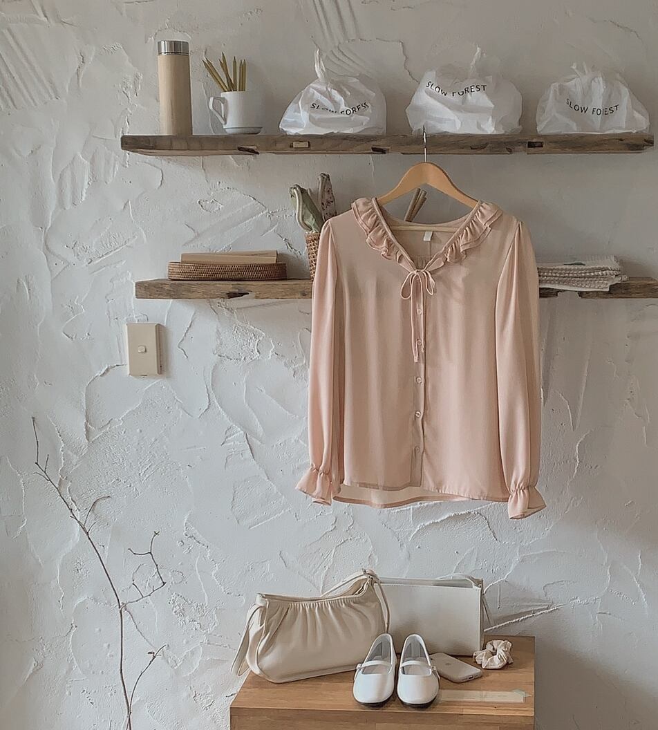 ネックラインにフリルをあしらったフェミニンな長袖ブラウスのご紹介です♪