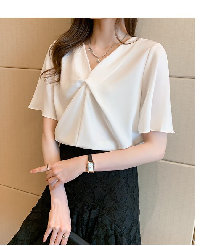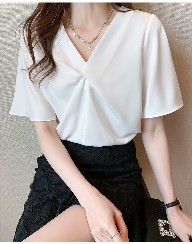 フレア袖とフロントのVネック、ツイストデザインがポイント。