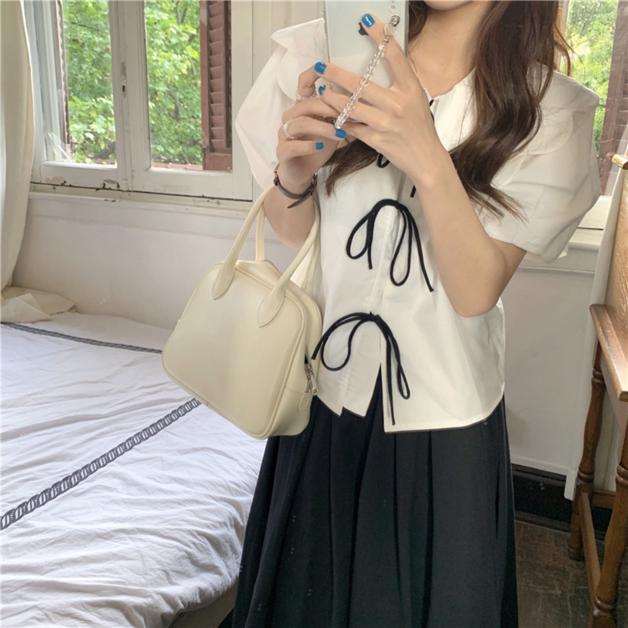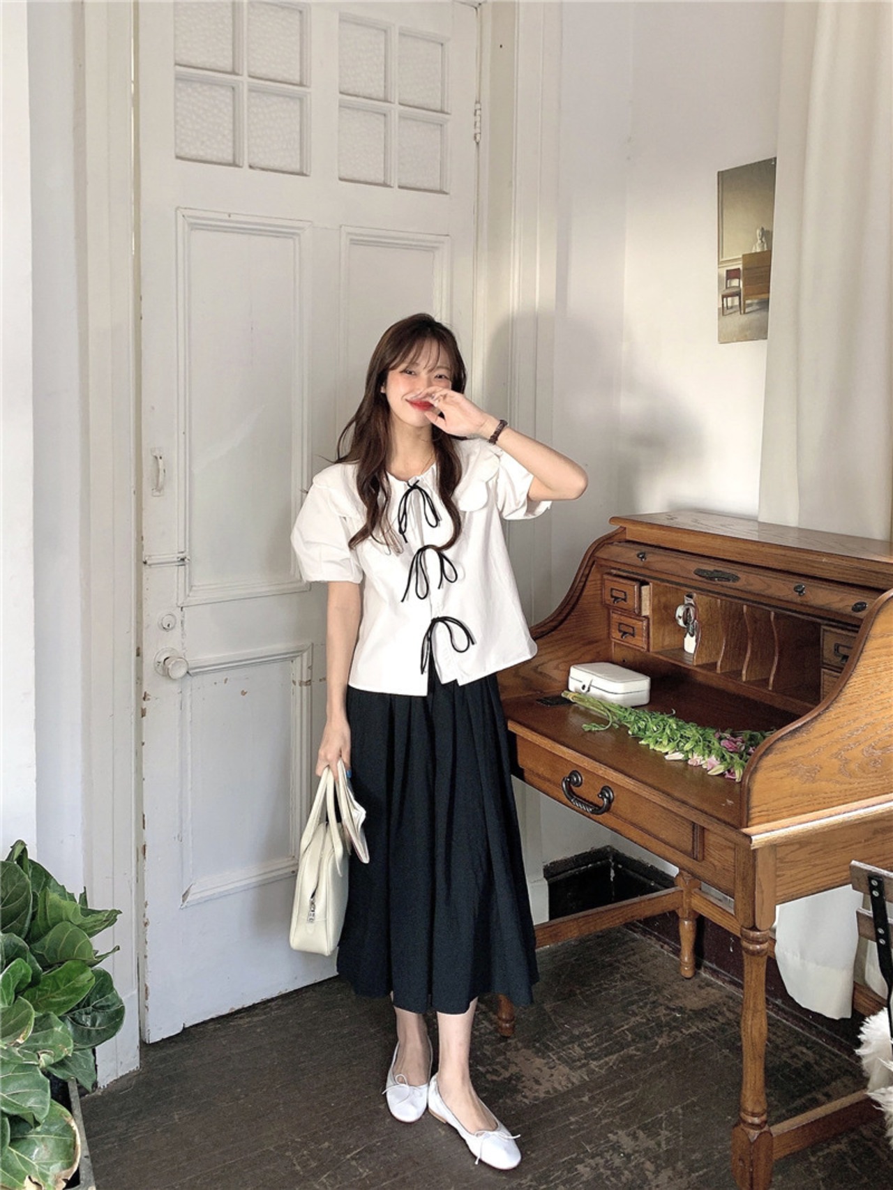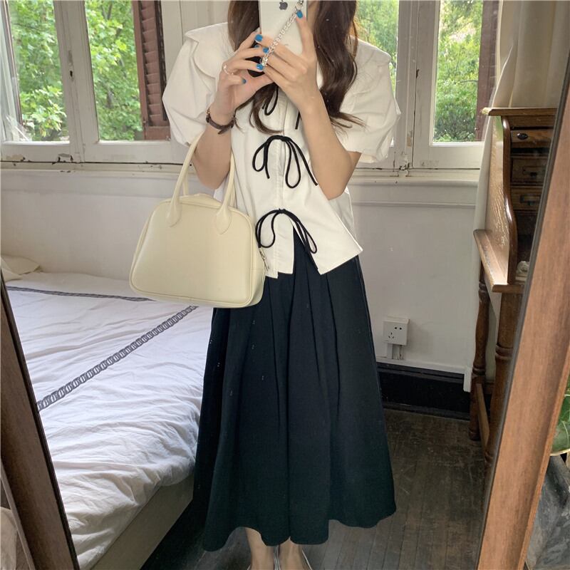 白黒のベーシックな色合いで仕上げたトップスとスカートのセットアップです◎