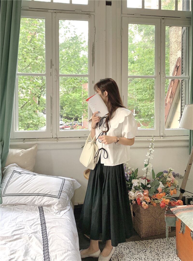 ガーリーなトップスをほどよく大人っぽく仕上げるスカートがセットになっています☆