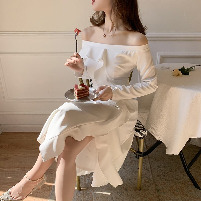 オフショルラインでデコルテやアクセサリー映えするおすすめのドレスです!