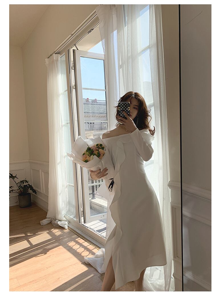 ロング丈を重たく見せないスリットラインにフリルを沿わせた華やかなデザイン。