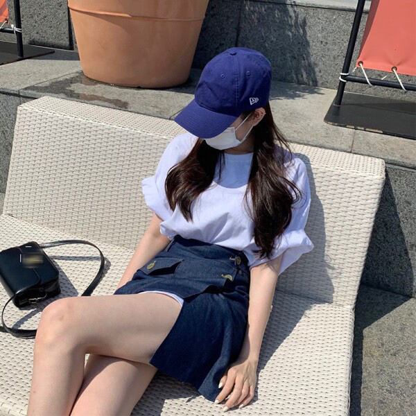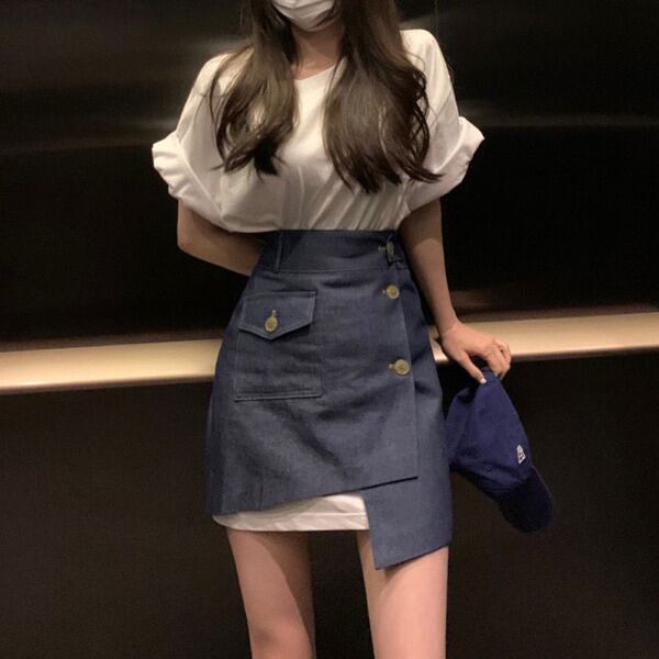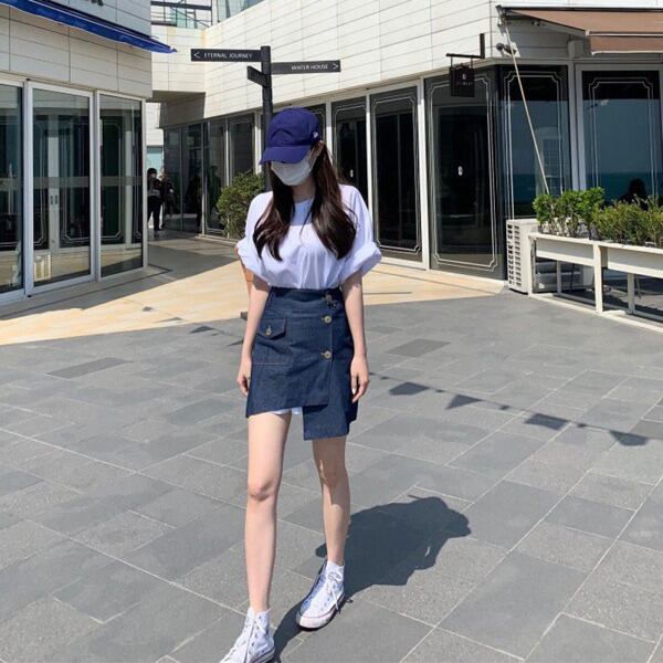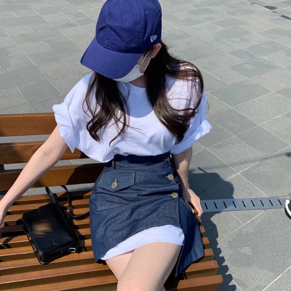 シンプルな無地Tシャツとデニムスカートのセットアップが登場しました◎