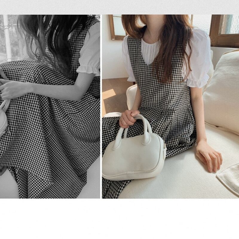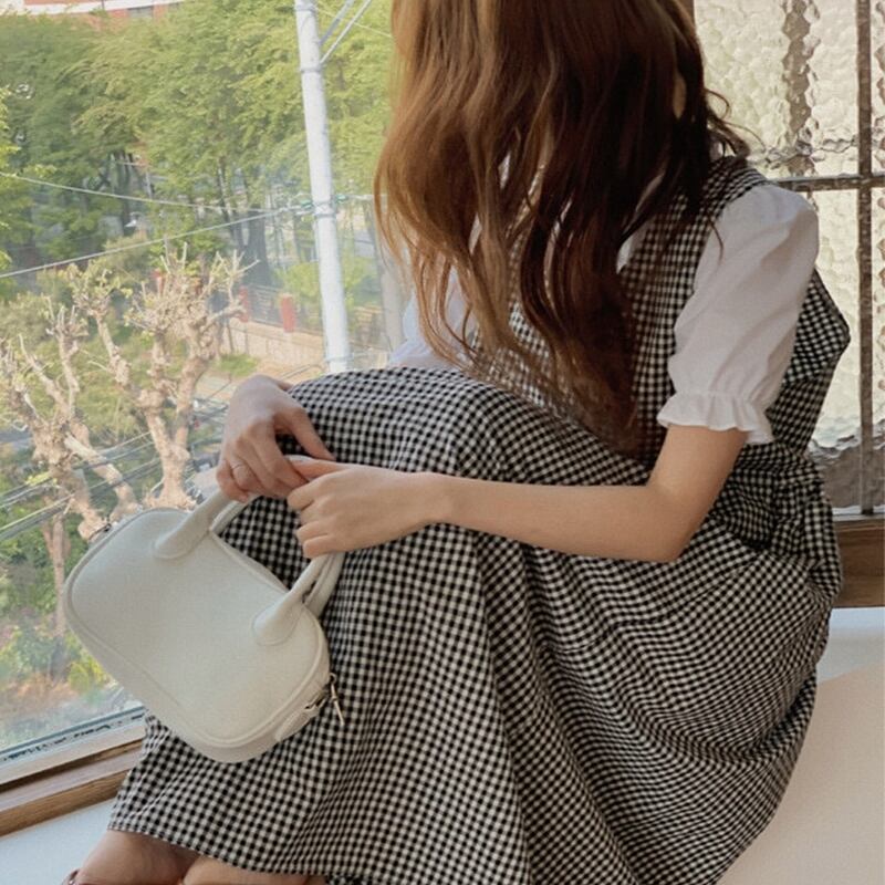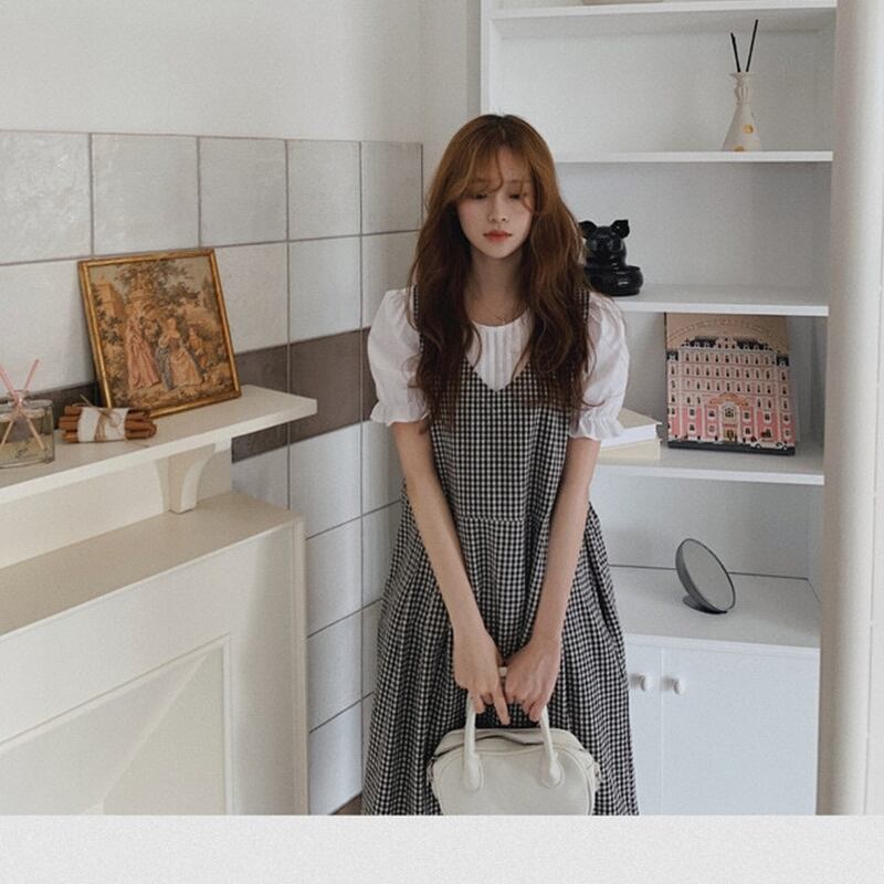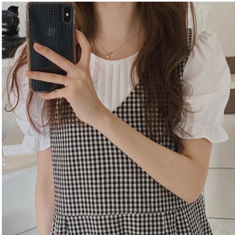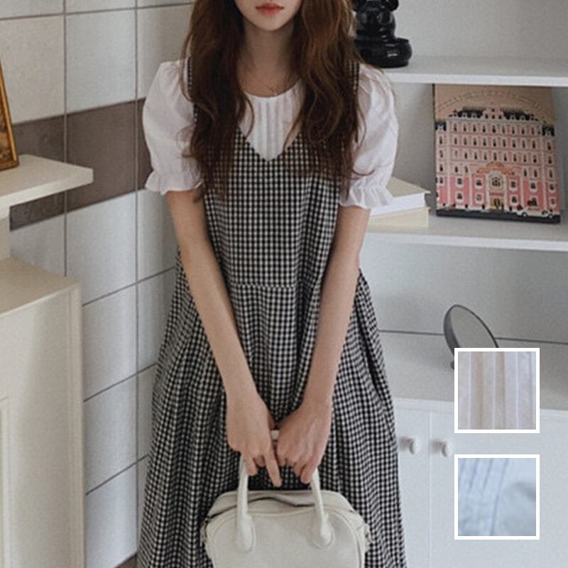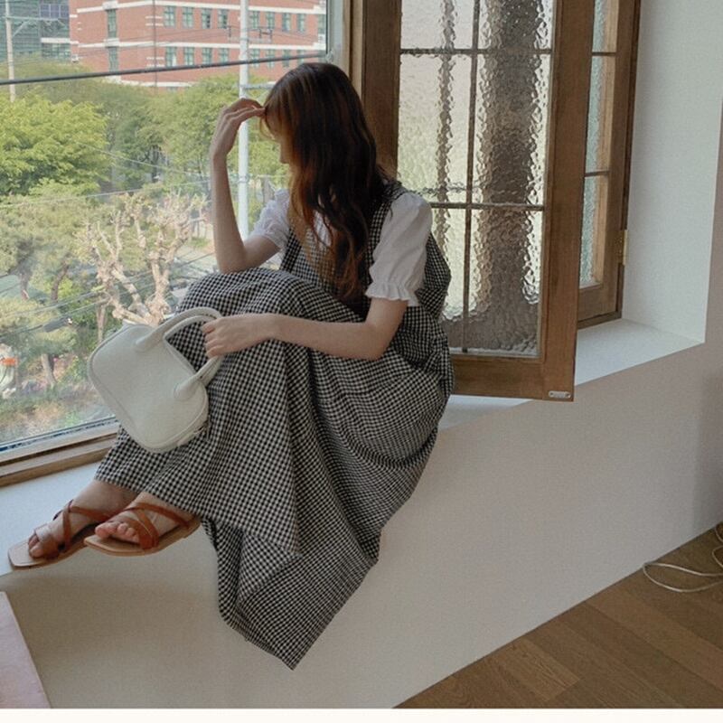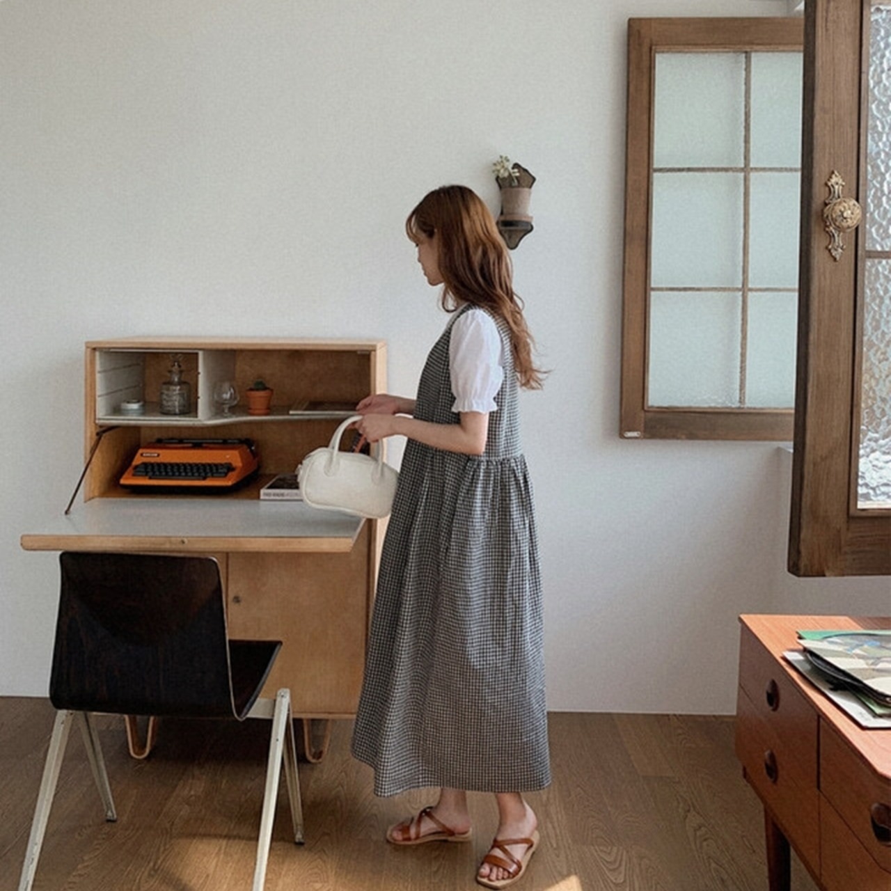 チェック柄のジャンスカと無地のトップスと合わせて夏のワンピスタイルに。