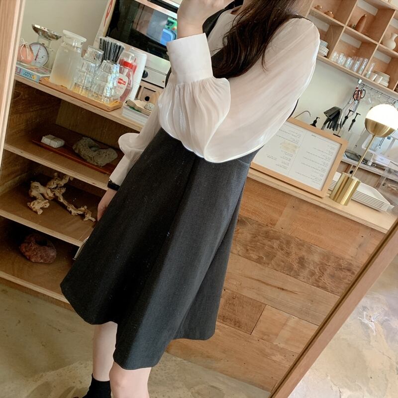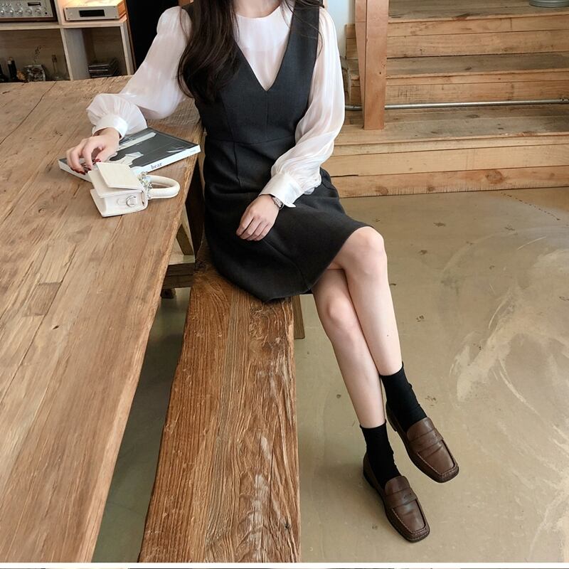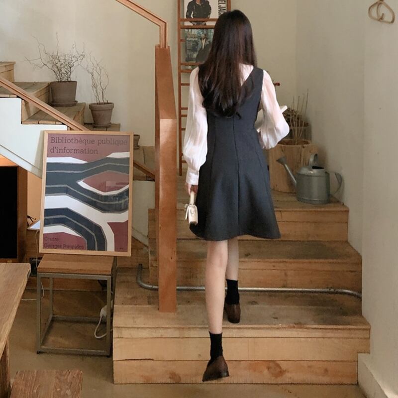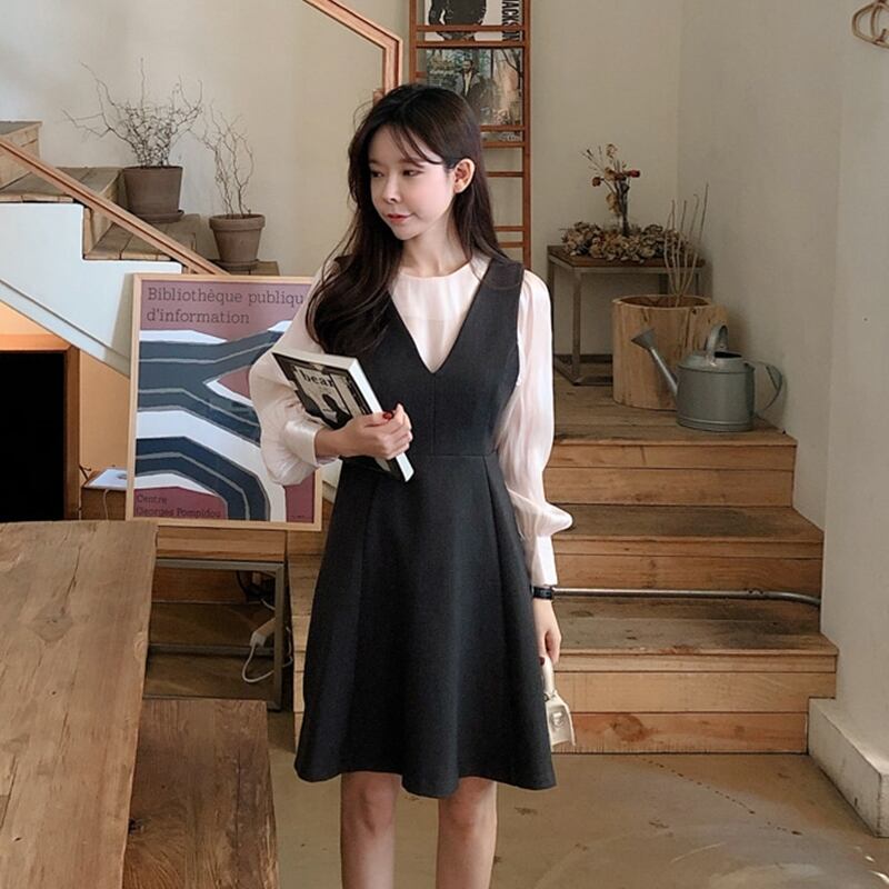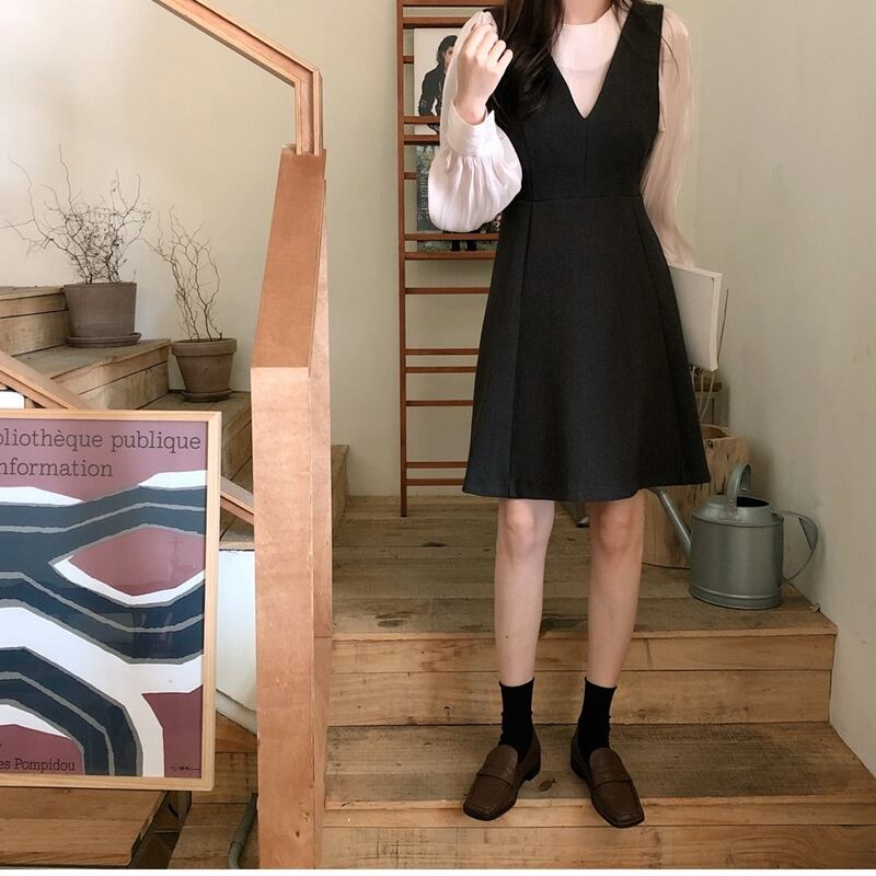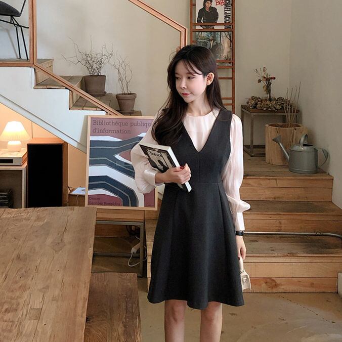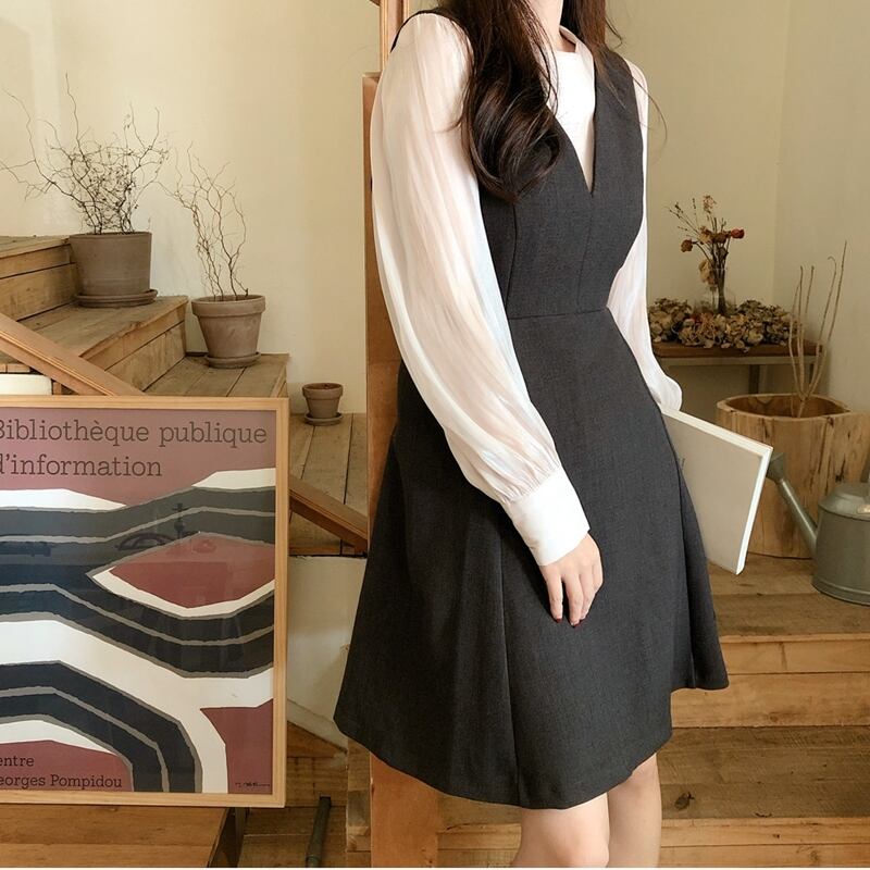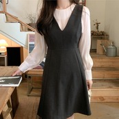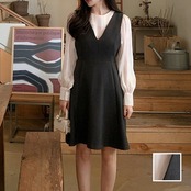 Vネックのノースリーブワンピースと長袖のトップスがセットに。