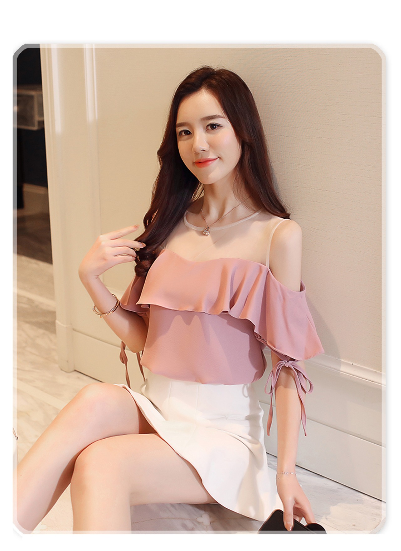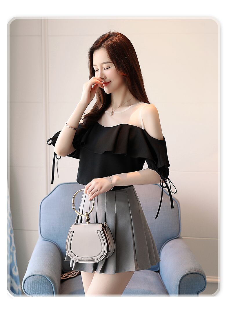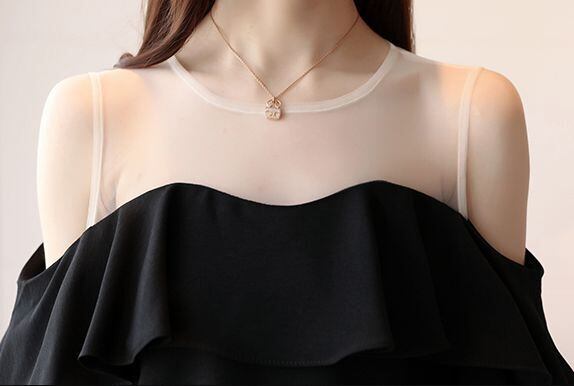 オフショルのようなゆるシルエットを作るシースルー切り替えのトップス。