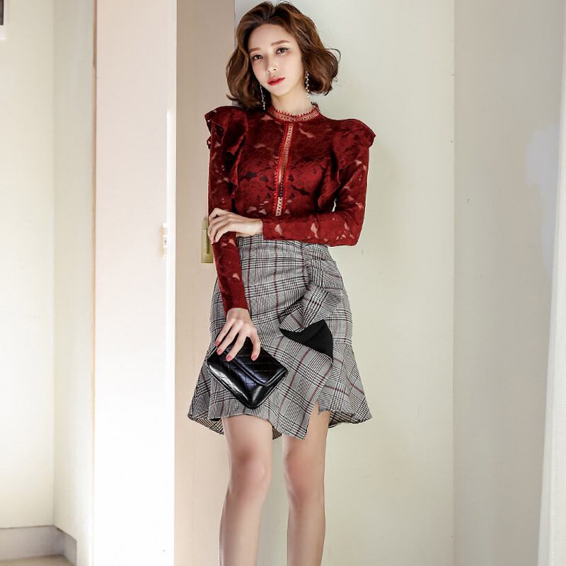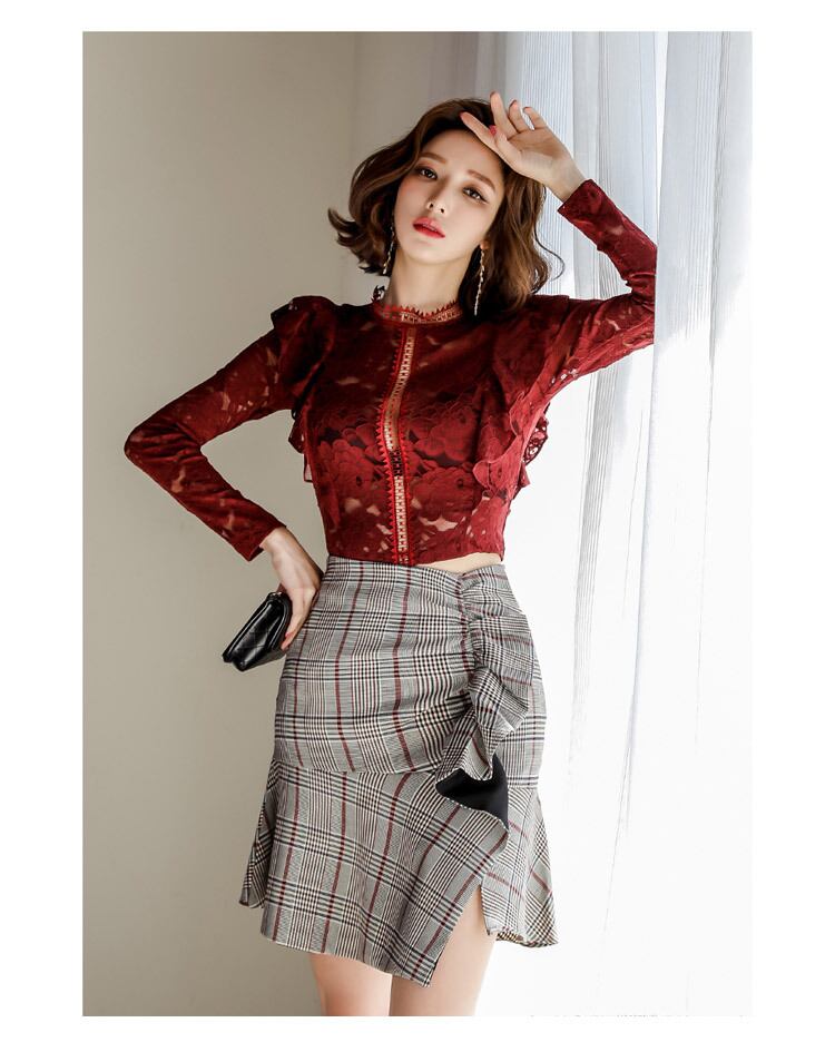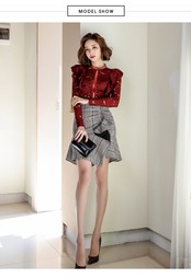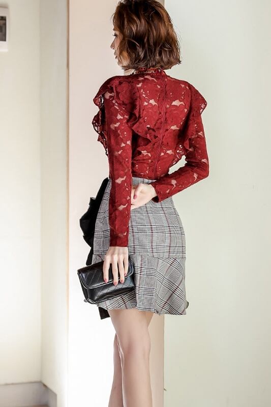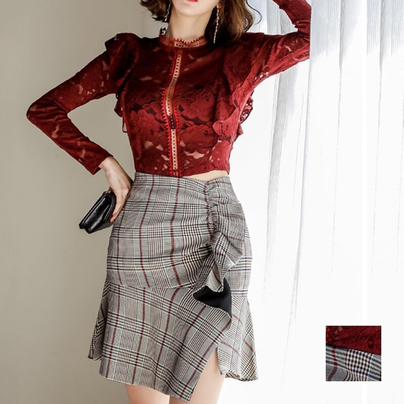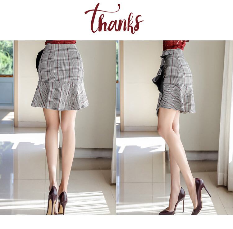 ミニ丈のタイトスカートはマーメイドシルエットとサイドフリル、チェック柄でディティール盛りだくさんになっています♪