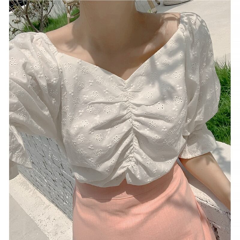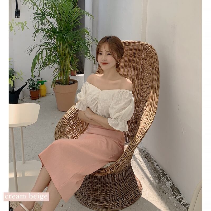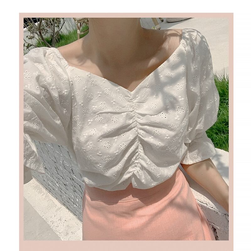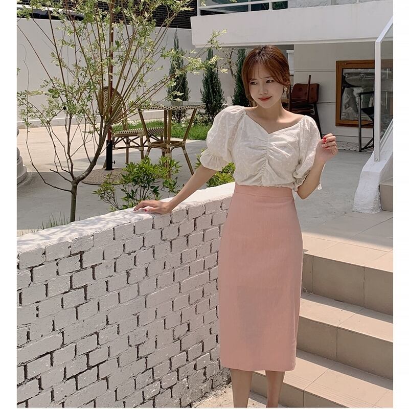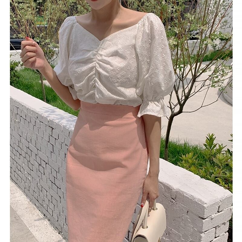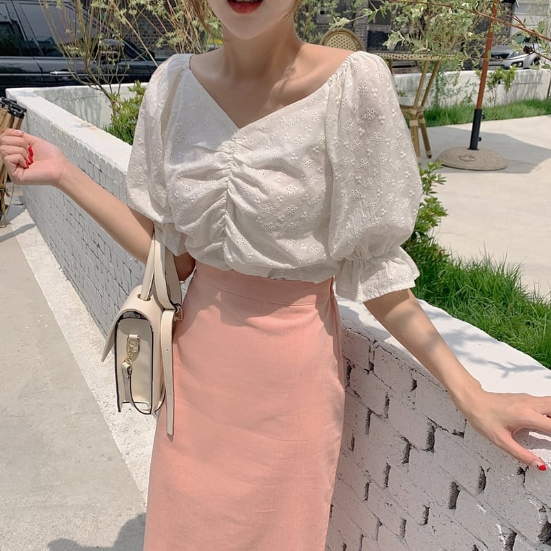 くしゅっと寄ったバストラインのトップスでフェミニンライクに◎