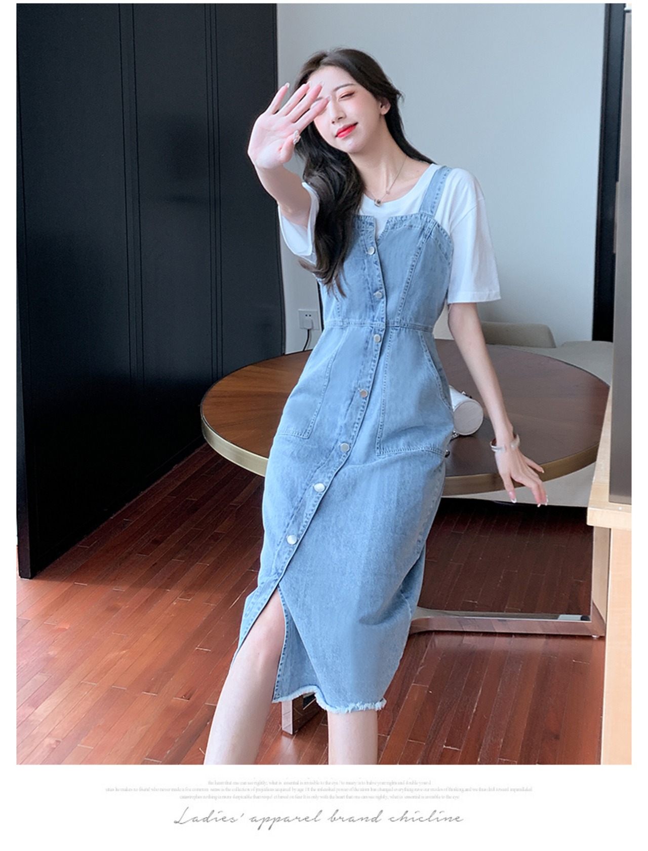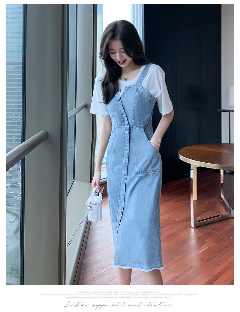 シンプルな無地のデニムとミモレ丈、ペンシルラインで子供っぽさをオフ。