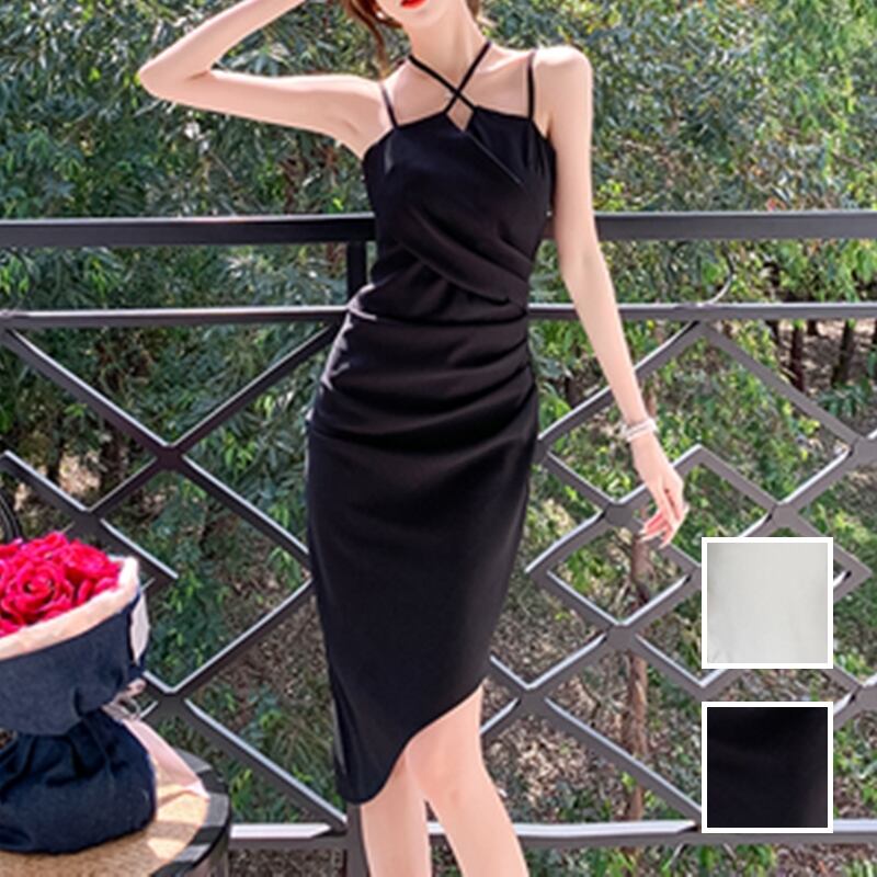 細めのストラップでホルターネックに仕上げたデザインタイトワンピースです。