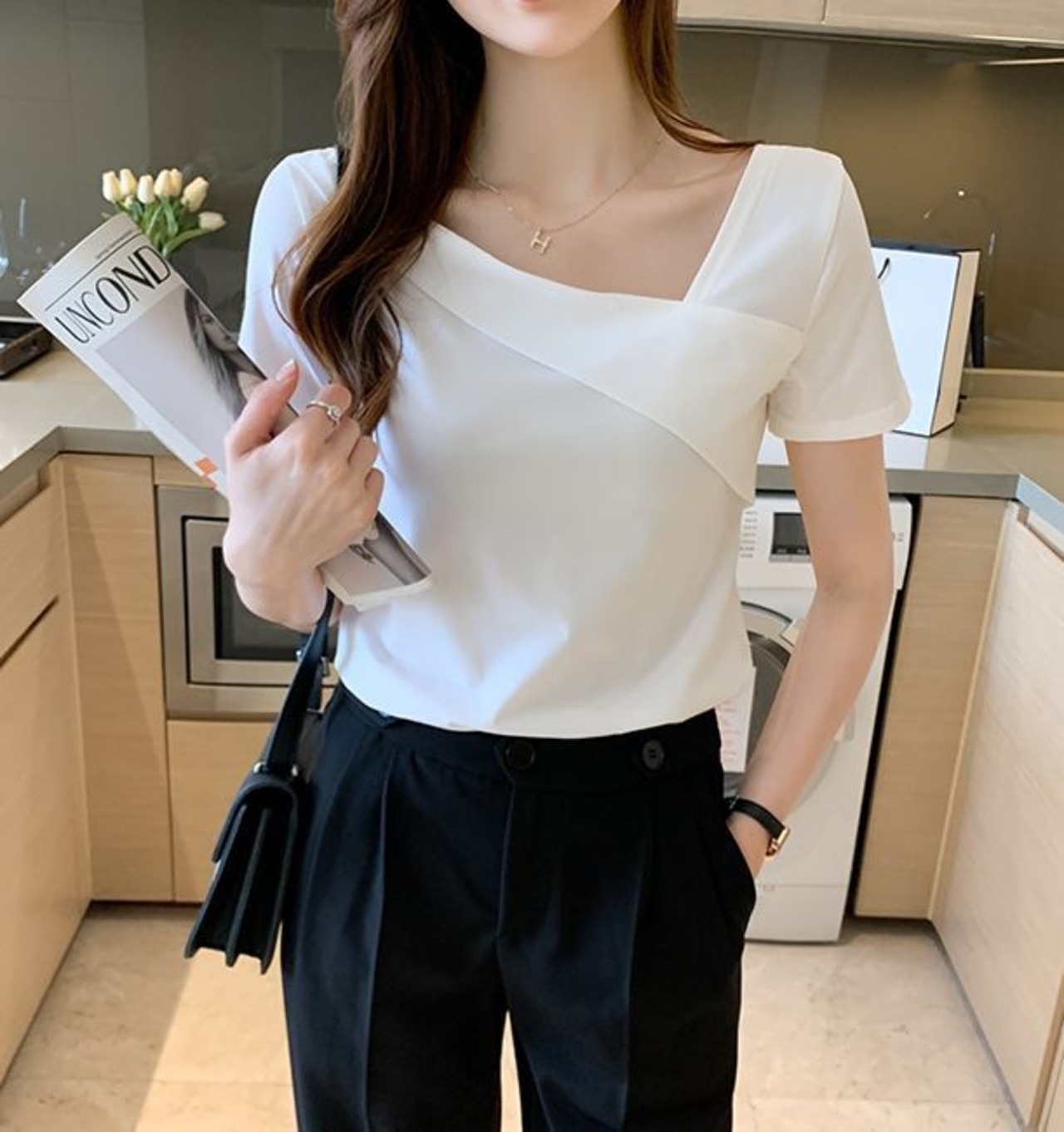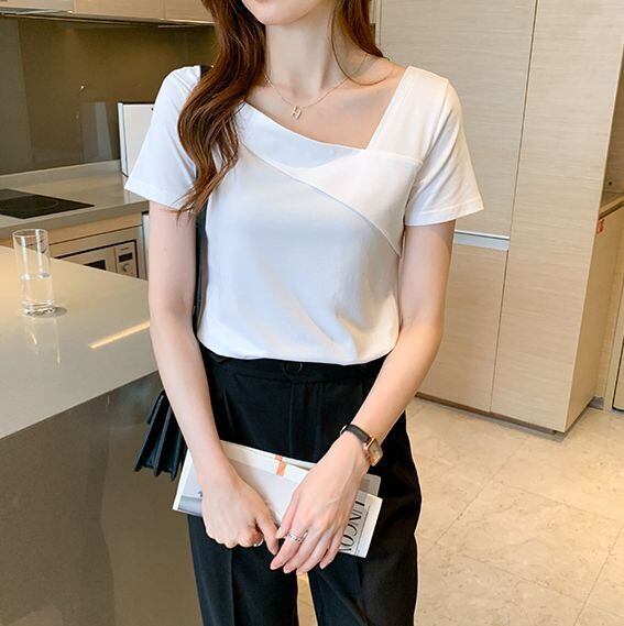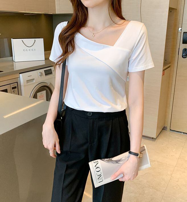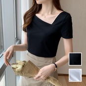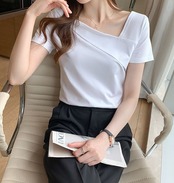 スクエアネックをななめにしたようなアシンメトリーなネックラインが特徴的。