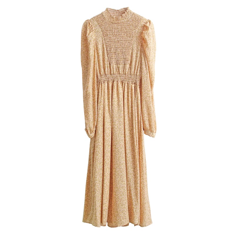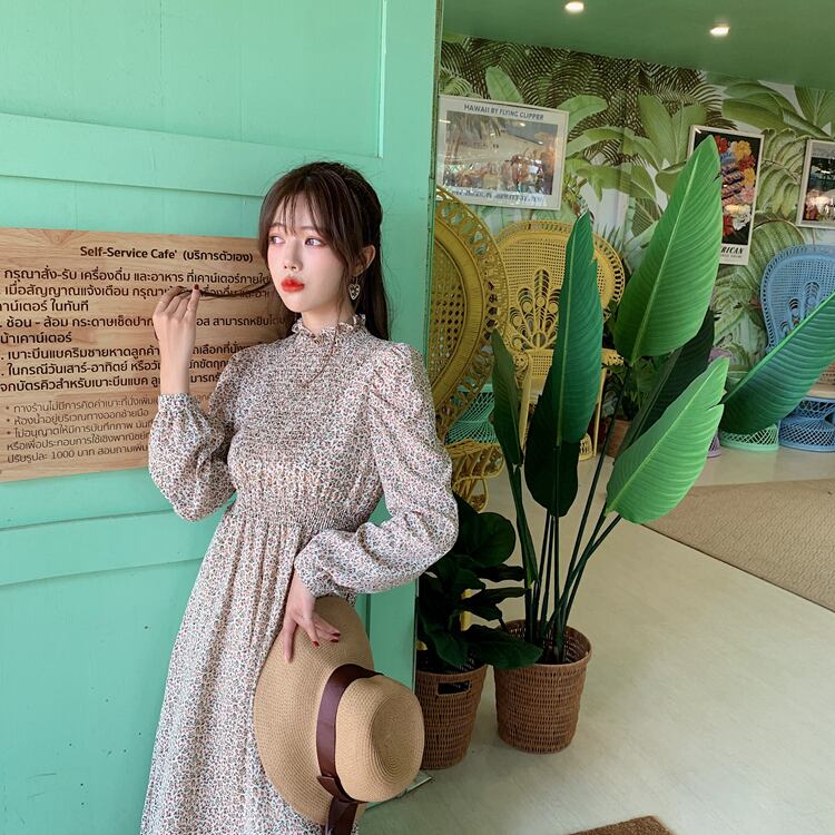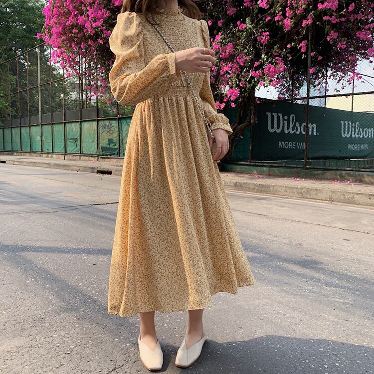 フリルハイネックで仕上げたイノセント&レトロなミモレ丈ワンピース♪