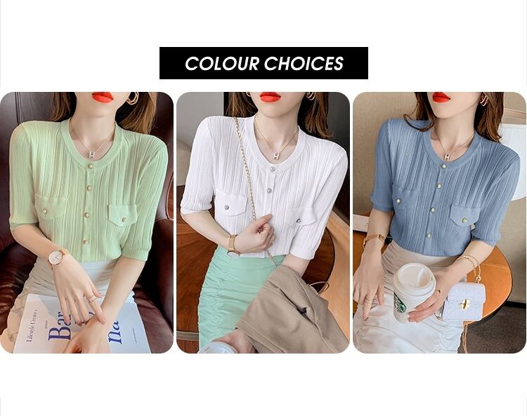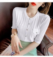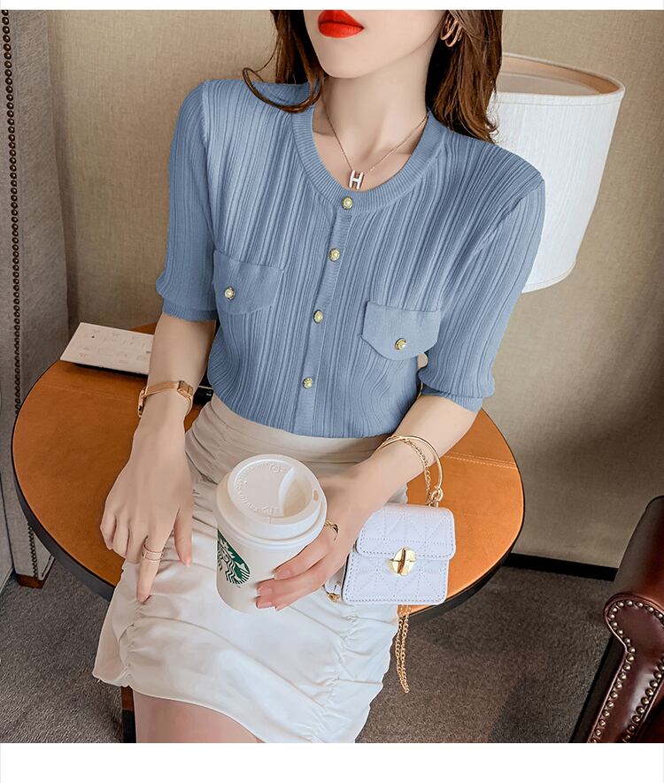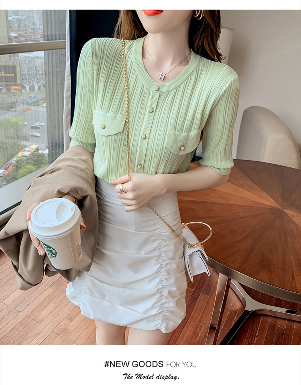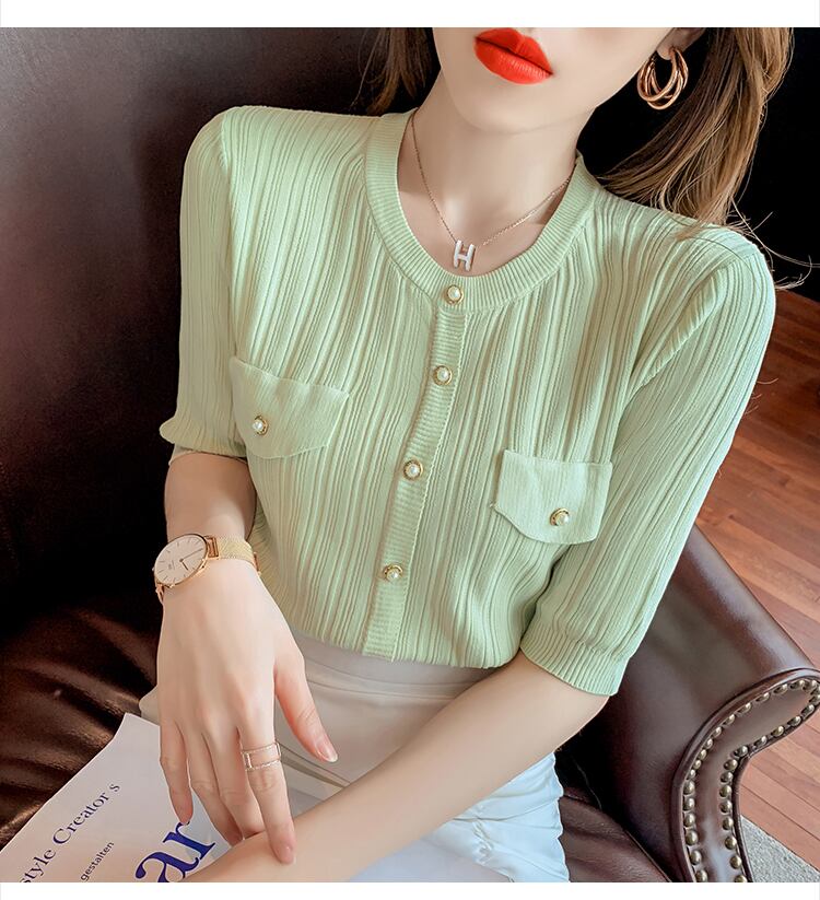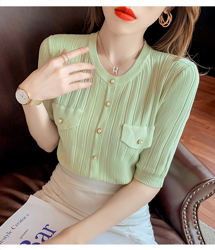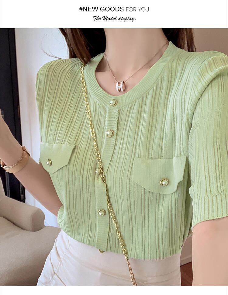 パールを囲んだ上品なボタンがフレンチライクに魅せてくれるサマーニットのご紹介です♪