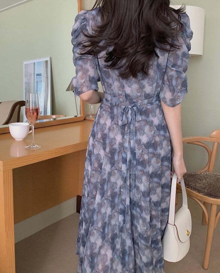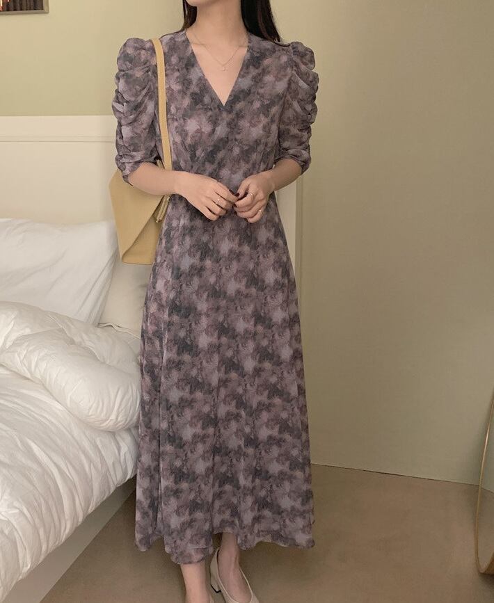 淡いダスティカラーと総柄デザインがシックなマキシ丈のワンピースが登場しました!