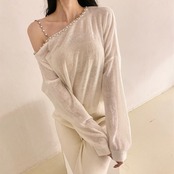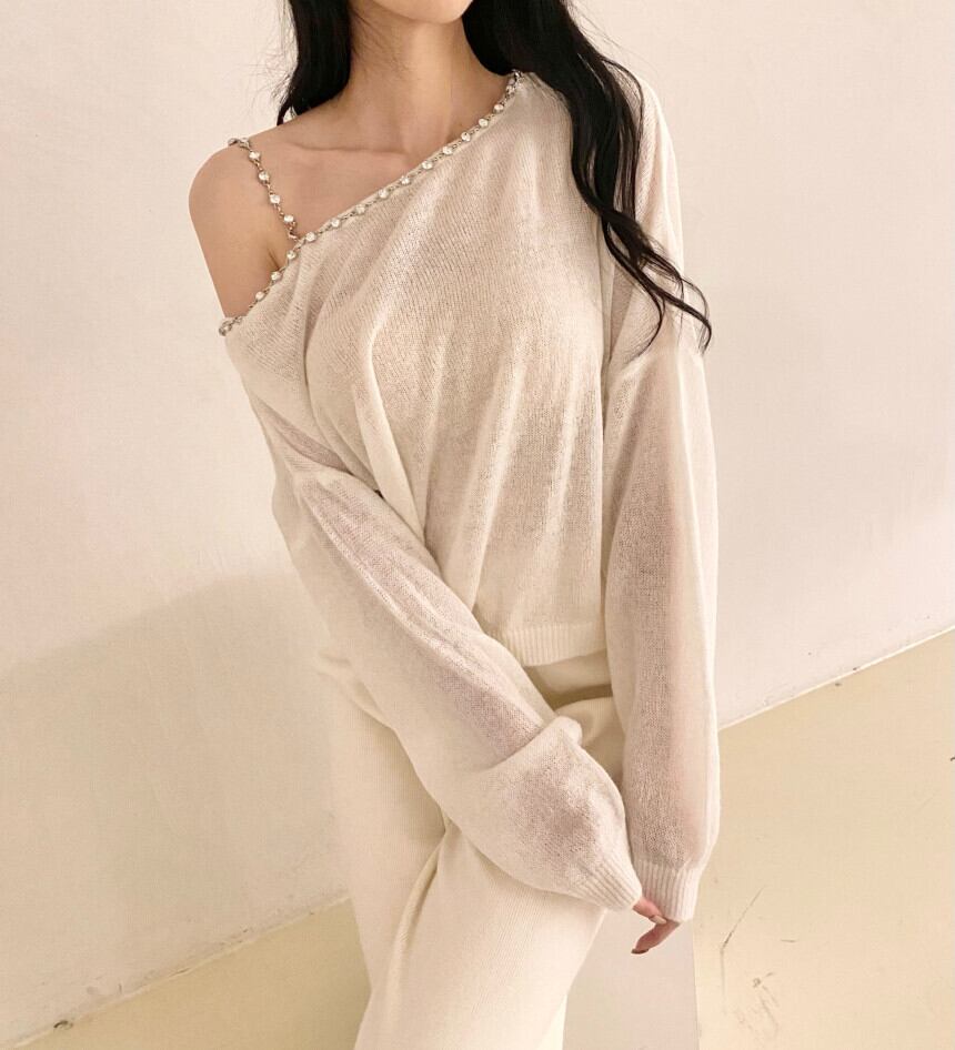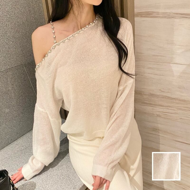 レディでモードなワンショルダーにパールをラインであしらったユニークなデザイン。