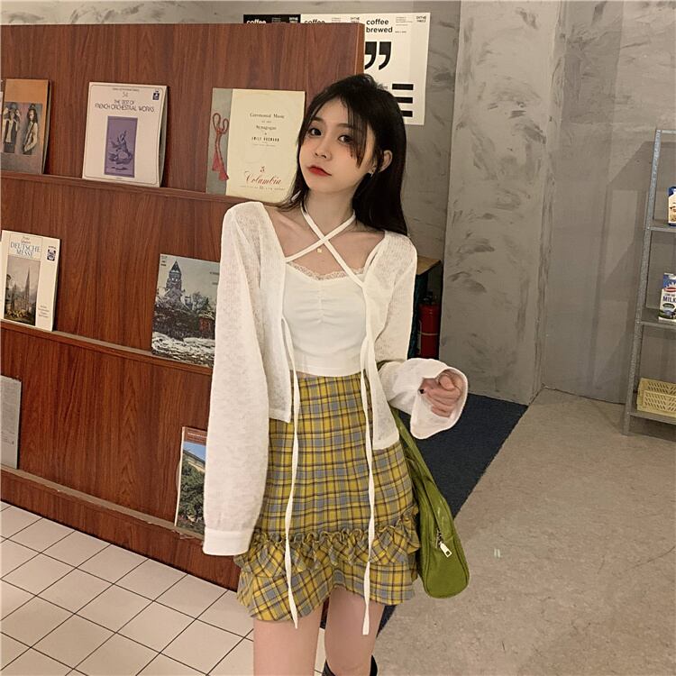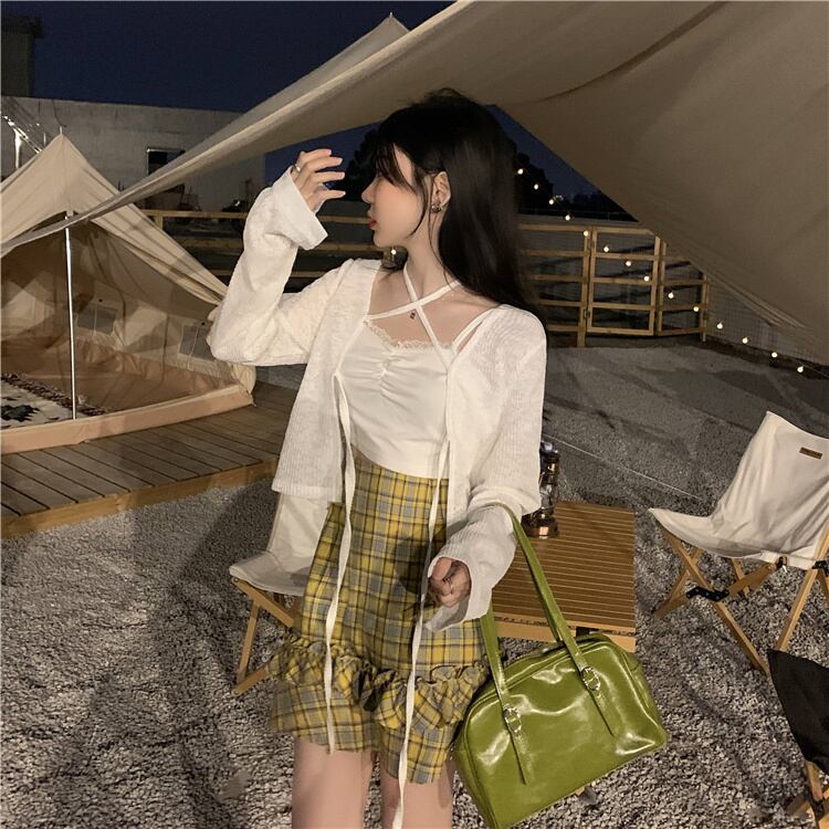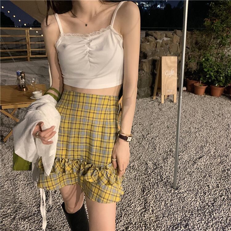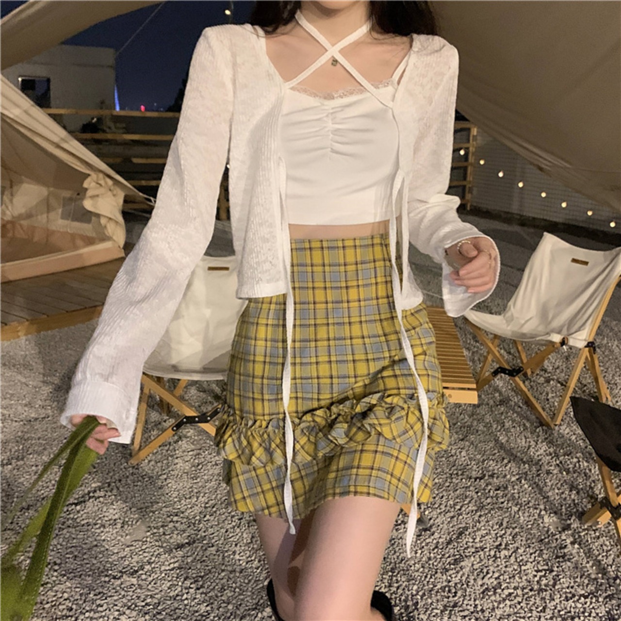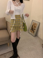 さらに、イエローベースのチェック柄で仕上げたスカートにはフリルをあしらってアクセントに。