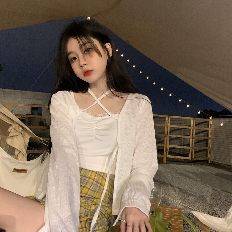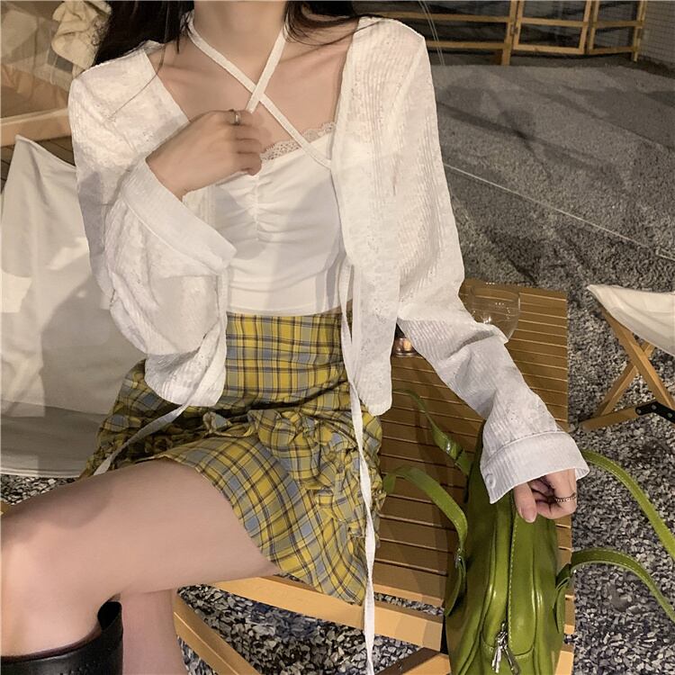 レーストリムのキャミソールとカラーを合わせた薄手のカーディガンがセットに♪