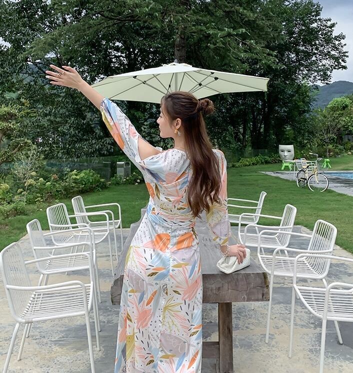 マルチカラーな総柄デザインが目を惹くミモレ丈のワンピースが登場しました!