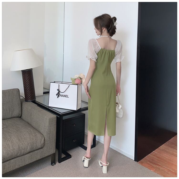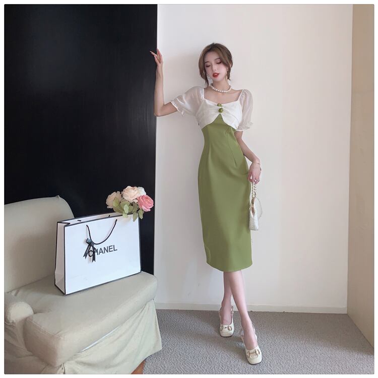 鶯色のような美しいレトログリーンをベースにしたバイカラーのワンピース。