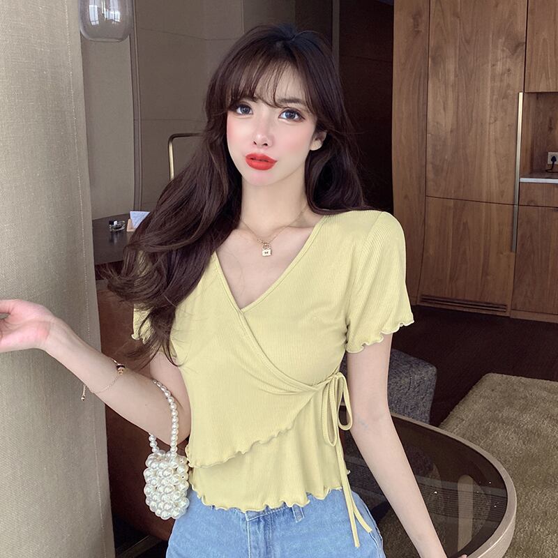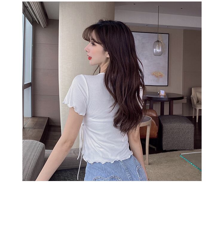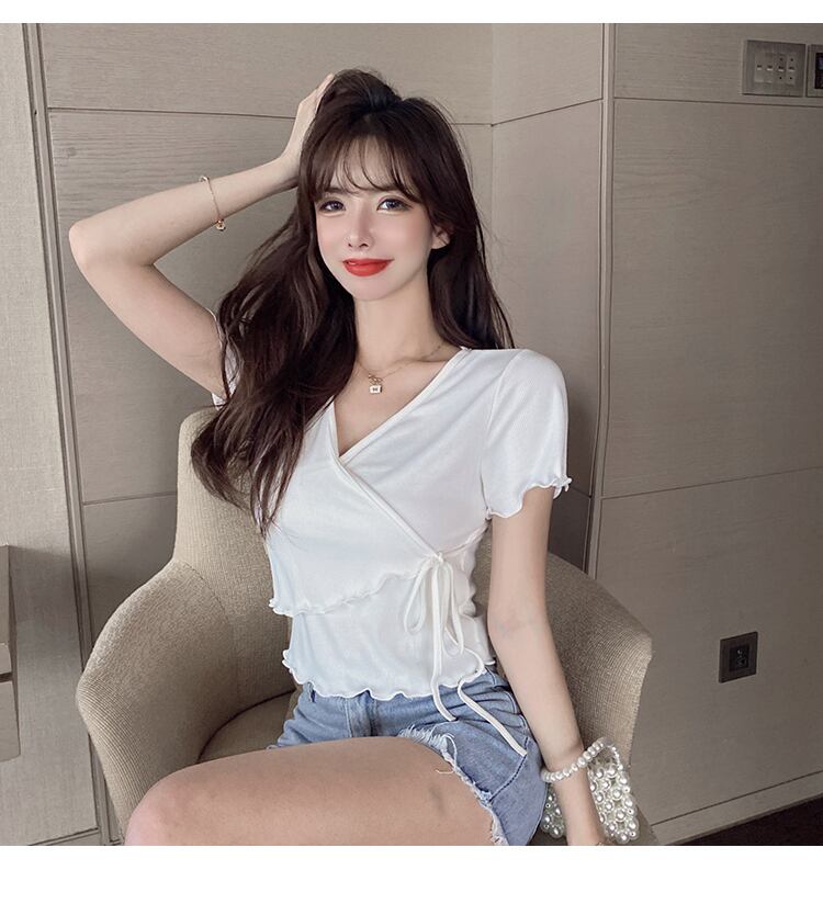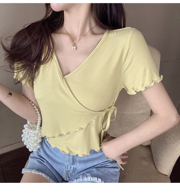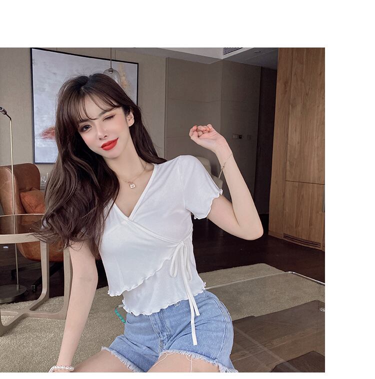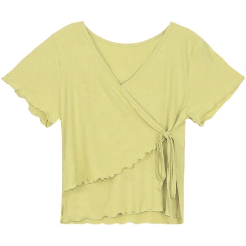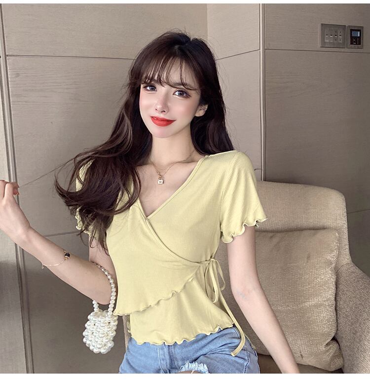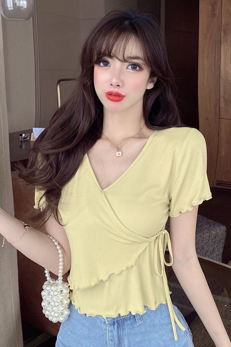 レタストリムとアシンメトリーなラップデザイン、リボンタイがポイントに。